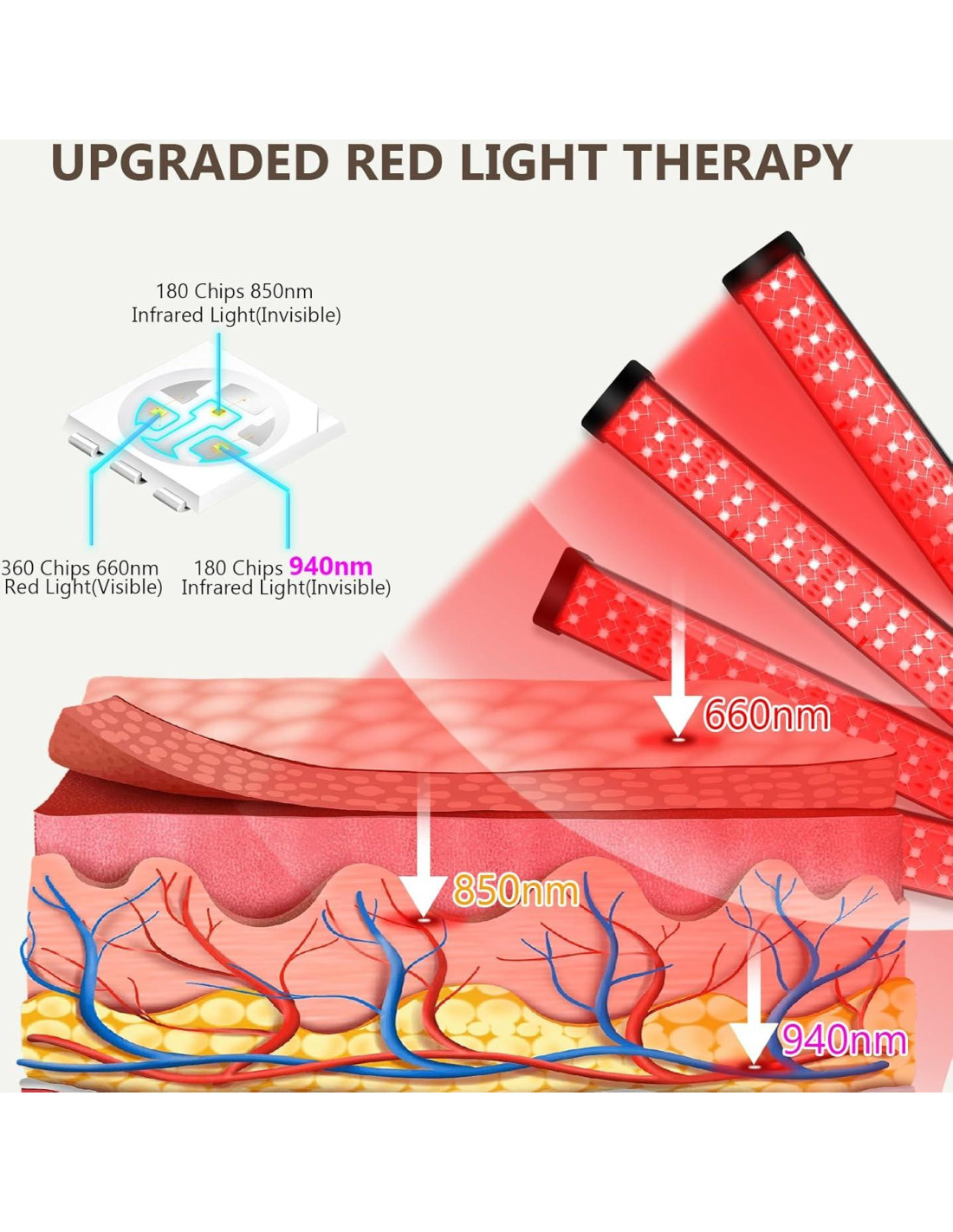 - 940nm Terapia Infrarroja Mejorada Una mejora científica para una experiencia de terapia de luz roja más profunda. Hemos agregado 180 chips infrarrojos de 940nm a la luz roja en comparación con las longitudes de onda de 660nm y 850nm. La luz infrarroja de 940nm llega más profundo para una respuesta más positiva y una experiencia verdaderamente refrescante. Tenga en cuenta que esta no es una lámpara de calor infrarroja tradicional y no hay sensación de calor notable al usarla.