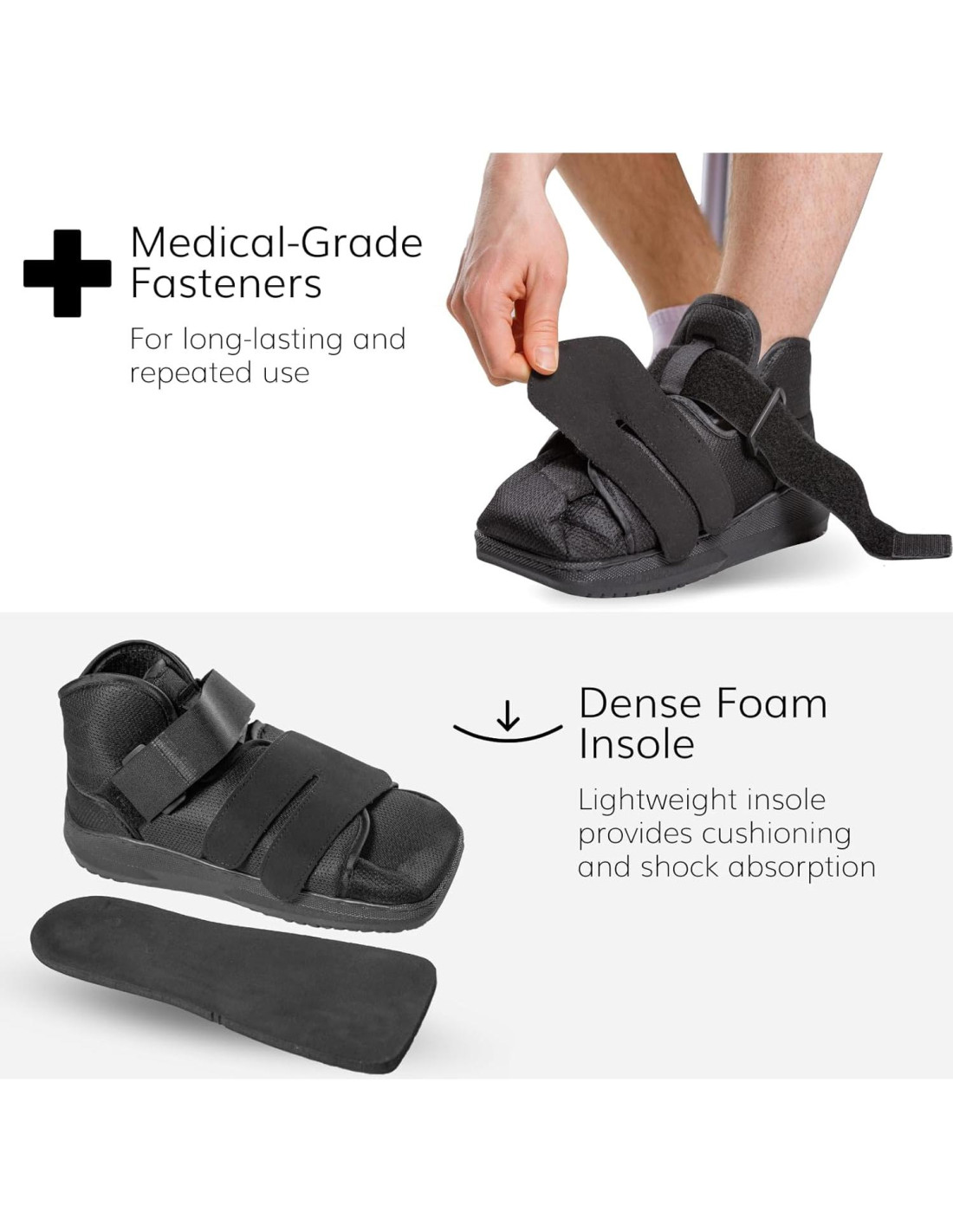 - Este zapato médico ofrece una excelente protección para tus dedos, pie, tobillo o pierna durante el proceso de recuperación post-operatoria; el botín para lesiones en el pie cuenta con un diseño de punta cerrada para mantener efectivamente tu yeso o vendajes secos y libres de suciedad
