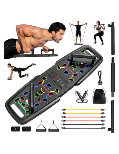 - Componentes incluidos: tabla de flexiones plegable, barra de 3 secciones, 6 bandas de resistencia, 2 correas para tobillos, ancla para puerta