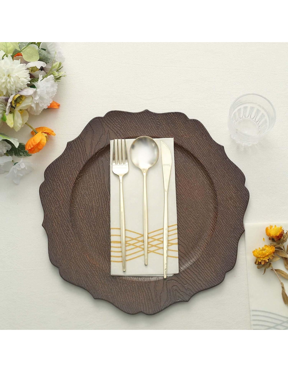 - Cantidad: 6 Platos Cargadores Material: Acrílico Color: Marrón Rústico Estilo: Texturizado de Madera Diámetro del Plato: 13" Diámetro Interno: 8" Grosor: 3mm Profundidad: 10mm Forma: Redonda