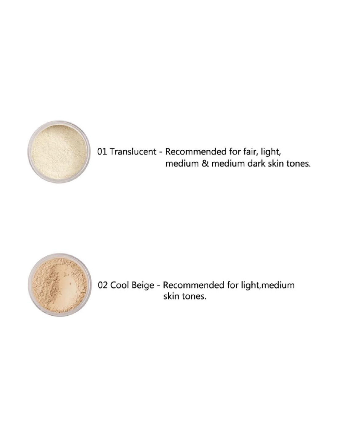 - Este polvo facial no contiene ingredientes estimulantes y no causará daño a la piel. Disponible en 4 tonos de cobertura total - 01 Translúcido, 02 Beige Frío.