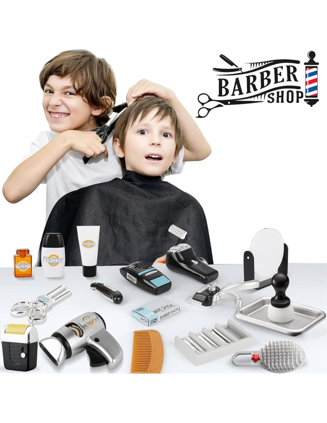 - Diversión de Barbería para Niños: Este set de juego de 24 piezas incluye todo lo que tu pequeño estilista necesita, desde afeitadoras y tijeras hasta un secador de pelo y un peine. Perfecto para horas interminables de juego de rol divertido.