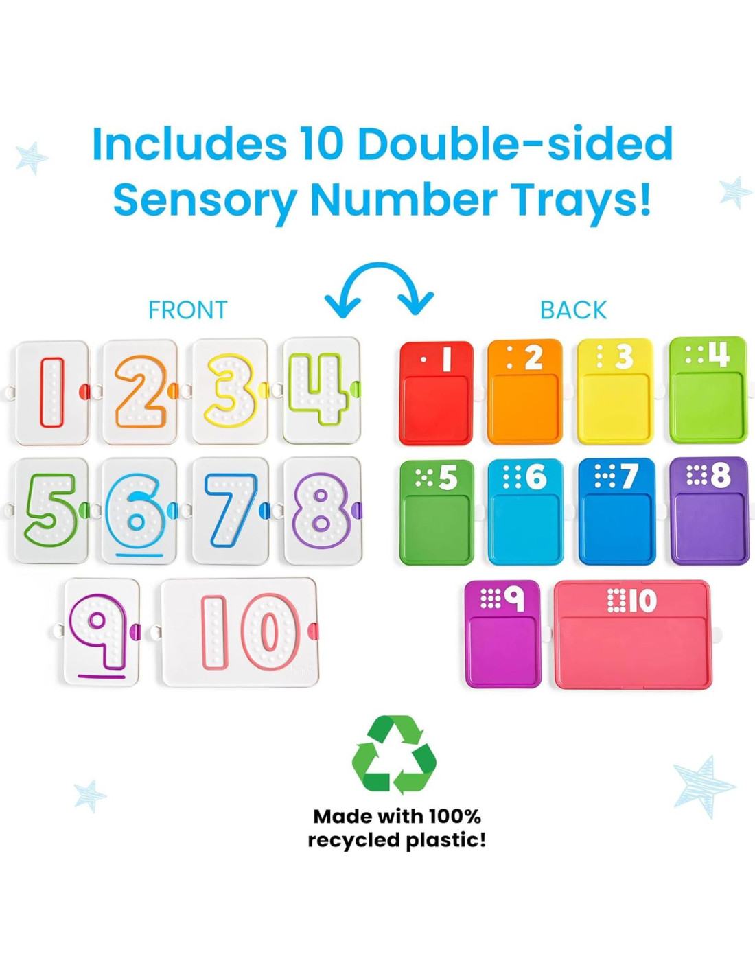 - JUGUETES TÁCTILES DE NÚMEROS: Este conjunto incluye 10 bandejas de doble cara que están hechas con plástico 100% reciclado.
