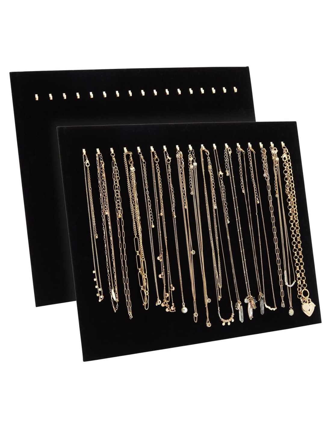 - Expositor de Joyería de Terciopelo Negro: Con 17 ganchos por bandeja, estos tableros de exhibición de collares de boutique negra pueden colgar un total de 34 pulseras, tobilleras, collares, cadenas y gargantillas
