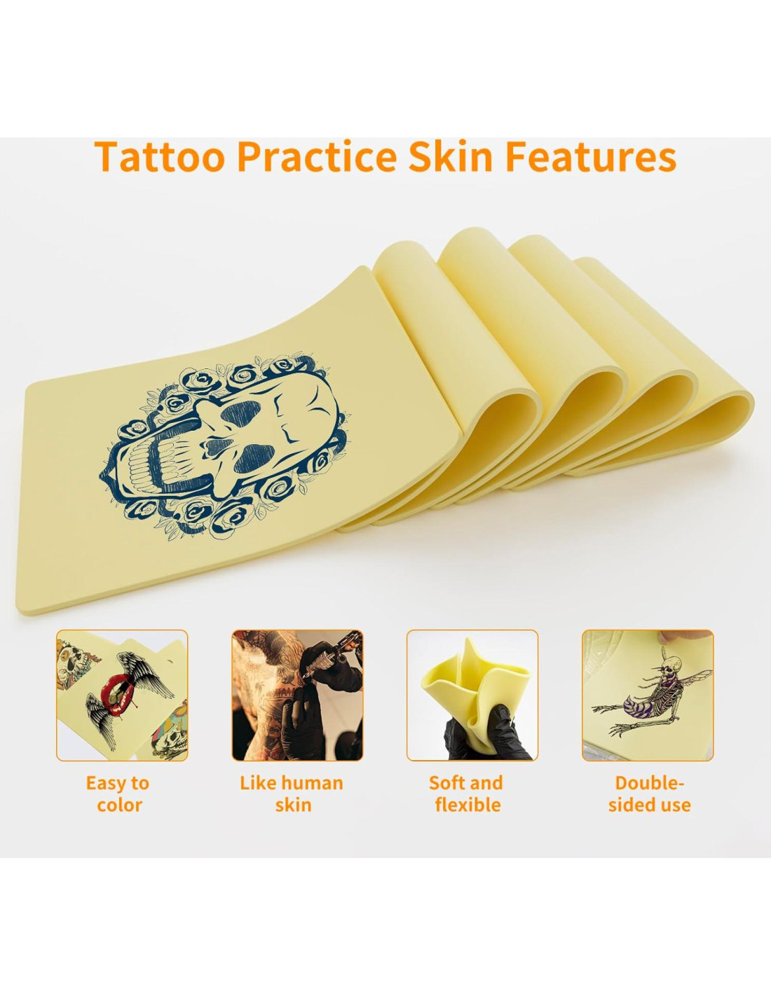 - Simulación Realista de Piel: Elaboradas con material de silicona de alta calidad, estas hojas de práctica de 3mm de grosor ofrecen una textura suave, flexible y estirable diseñada para imitar de cerca la sensación y respuesta de la piel humana durante el tatuaje.