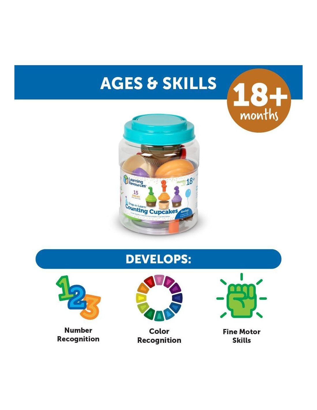 - Edades y Etapas: Diseñados especialmente pensando en los más pequeños, los Cupcakes para Contar Snap-n-Learn ayudan a los niños tan jóvenes como 18 meses a desarrollar habilidades esenciales para preescolar.