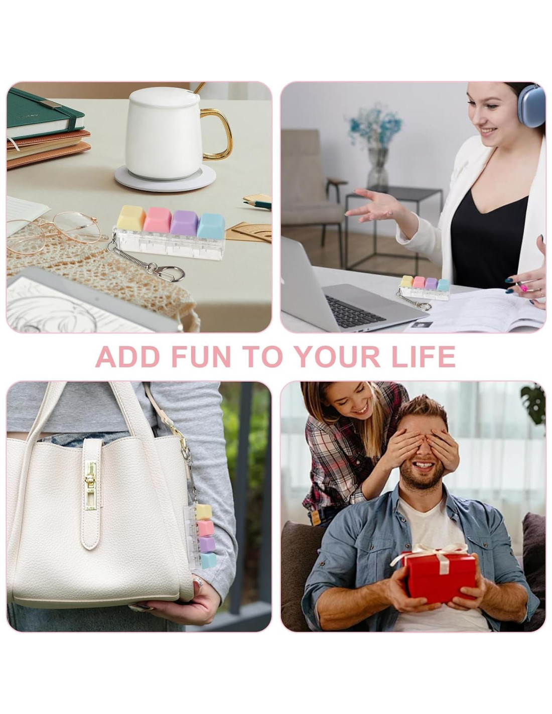 Experimenta la satisfacción táctil con este innovador juguete de teclado antiestrés diseñado para el alivio del estrés y la gestión de la ansiedad. Con cuatro líneas de botones distintas en vibrantes colores rosa, verde, azul y naranja, este juguete antiestrés te permite ejercitar los cuatro dedos simultáneamente. La textura mate y esmerilada proporciona una sensación cómoda, mientras que el satisfactorio sonido de clic ayuda a calmar las mentes inquietas. Diseñado para la portabilidad, viene con un duradero llavero de acero inoxidable 304 que se adhiere fácilmente a tus llaves, mochila o cremallera. El diseño ergonómico asegura un uso cómodo durante períodos prolongados, lo que lo hace perfecto para momentos en los que necesitas liberar tensión o mantenerte concentrado. Ya sea en el trabajo, la escuela o en casa, este accesorio antiestrés elegante y funcional ofrece una experiencia táctil única que combina atractivo visual con un alivio práctico del estrés. La combinación de colores Macron añade un toque moderno a este versátil juguete antiestrés que puedes llevar a cualquier lugar.