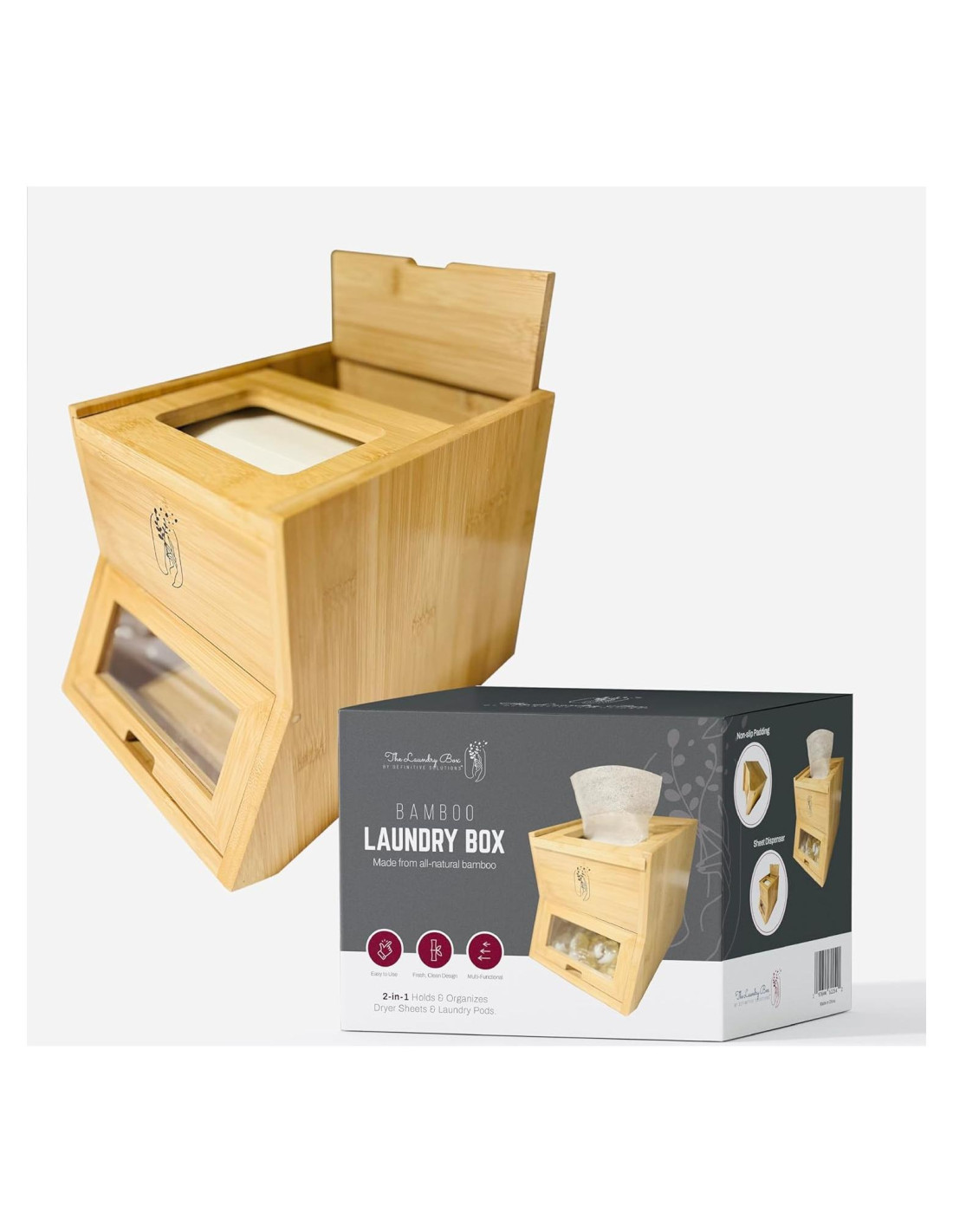- Diseño funcional 2 en 1: La caja de bambú es simple de llenar, fácil de mantener limpia y cuenta con un dispensador conveniente superior y frontal. Dimensiones: (26.67 cm x 19.56 cm x 21.59 cm), Capacidad: Sostiene hasta 75 cápsulas de lavandería y más de 175 hojas de secadora.