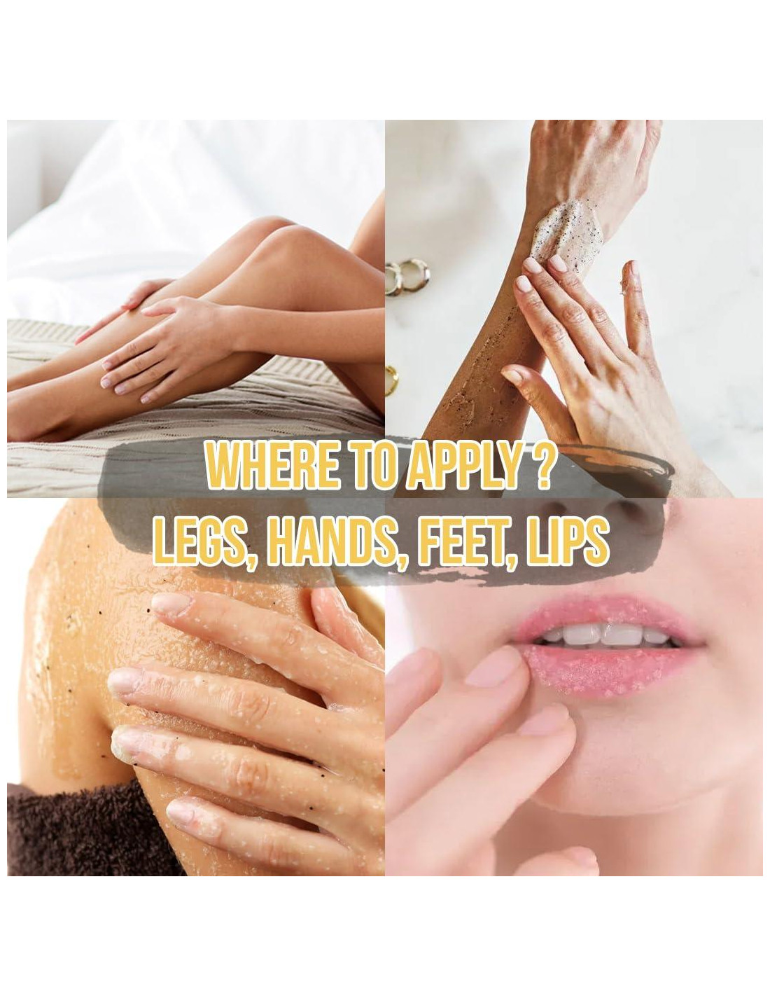 - ÚSALO ANTES DE AFEITAR: ¿Quieres afeitarte las piernas rápida y fácilmente? Entonces masajea tus piernas con el exfoliante de oro de 24K antes de afeitarte. El exfoliante corporal hará que tu vello sea más suave y más fácil de cortar con tu rasuradora. Además, la exfoliación evitará que los vellos crezcan debajo de tu piel. ¡Afeitarse nunca ha sido tan fácil!
