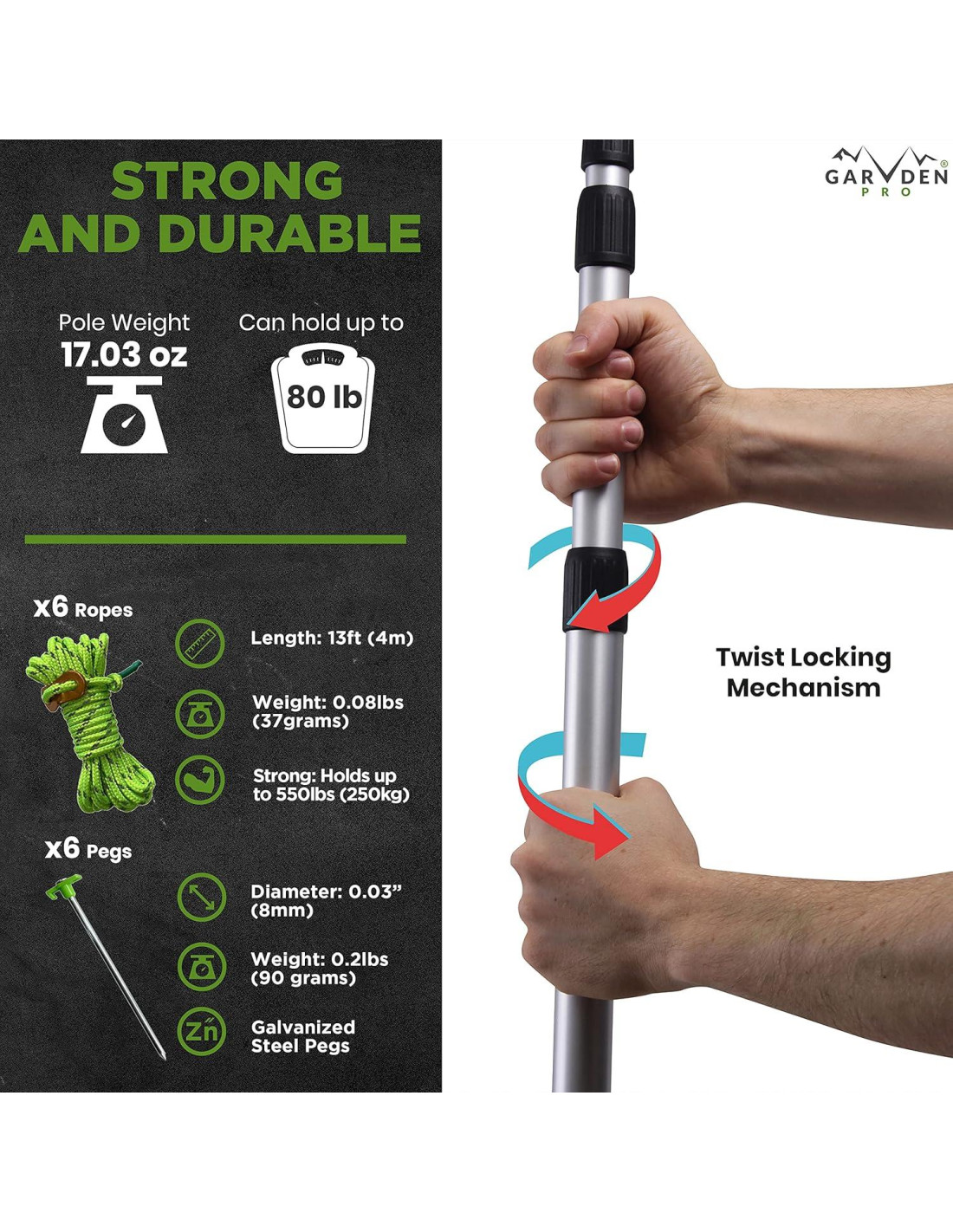 - FUERTE Y LIVIANO: Garden V PRO presenta el compañero de camping perfecto. Nuestros postes están hechos de acero de aluminio y son fuertes y duraderos, pueden soportar hasta 36.29 kg cada uno mientras pesan solo 482.8 g! ¡Tan livianos que no lo sentirás mientras caminas! ¿Tienes una tienda? ¿Toldos? ¿Lluvia? Te tenemos cubierto para cualquier aventura de camping que busques.