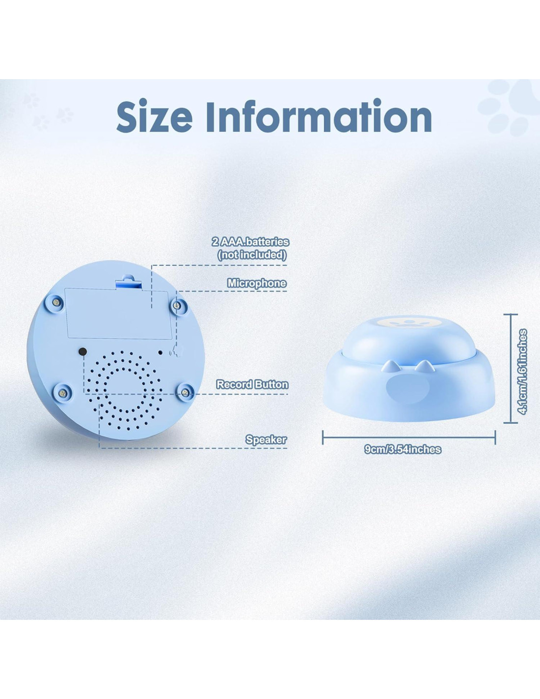 - Clear Audio and Perfectly Sized Cada botón graba hasta 30 segundos de audio claro, con 3.54 pulgadas (9 cm) de diámetro, encajando perfectamente bajo las patas de su mascota. Disponibles en durazno y azul cielo, cada uno adornado con un lindo diseño de huella