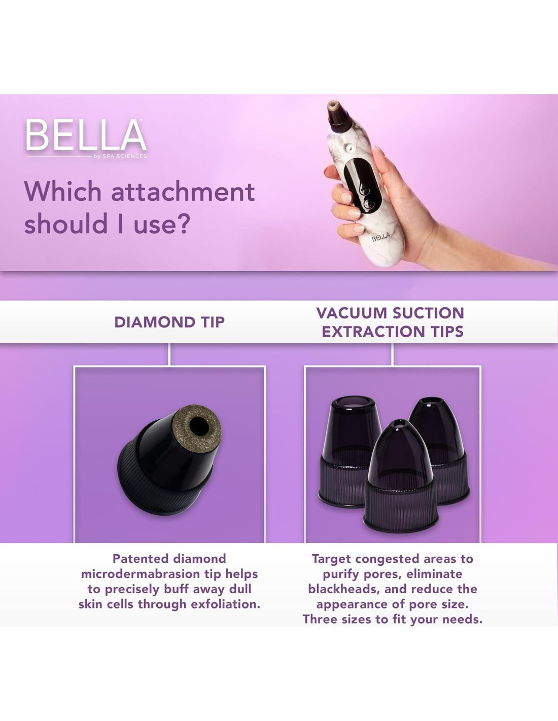 - MICRODERMOABRASIÓN - El diseño patentado de BELLA utiliza puntas de diamante cortadas con precisión para eliminar de manera precisa las células muertas de la piel, revelando una piel fresca y radiante.