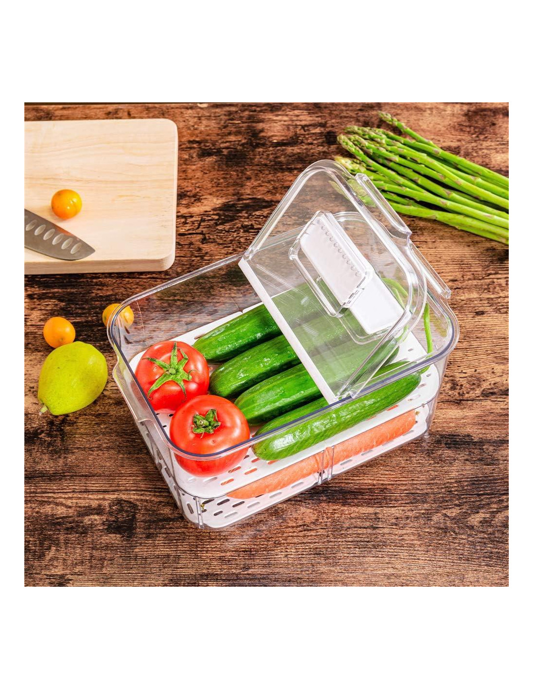 - DISEÑO MULTIFUNCIONAL: La bandeja de filtro en la parte inferior eleva los productos lejos de la humedad y puede almacenar directamente después de limpiar, para filtrar el agua en la superficie de las verduras y frutas y reducir el deterioro; se pueden combinar para mejorar la utilización del espacio en el refrigerador.