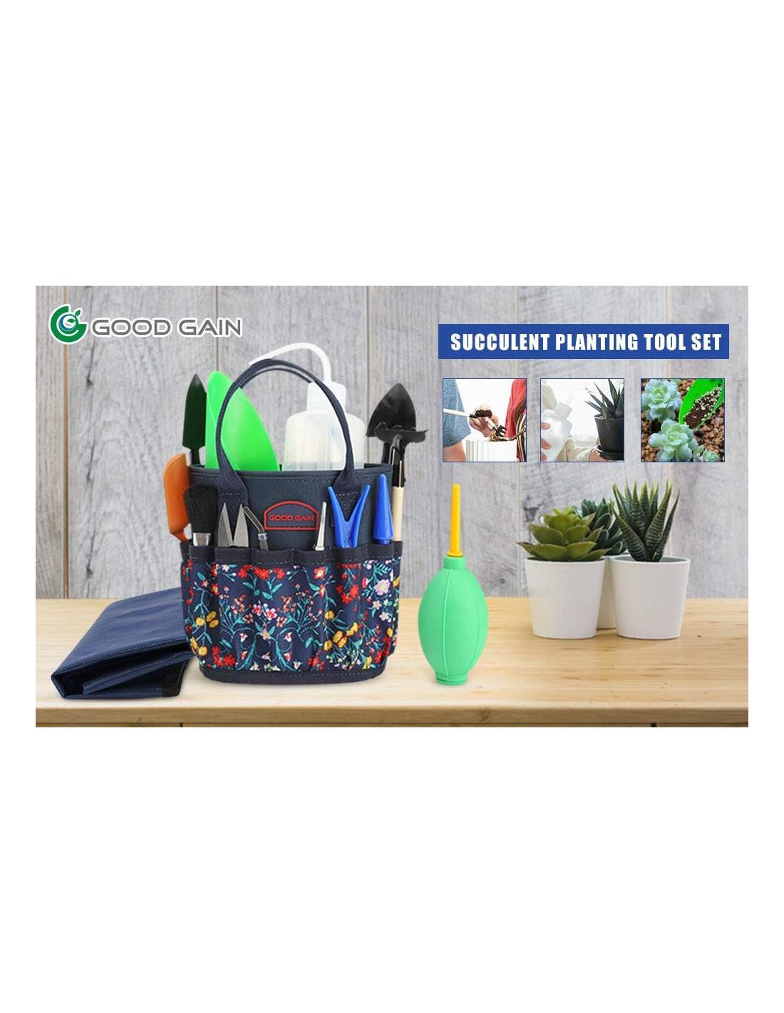 INCLUYE: Bolsa organizadora de alta resistencia de material PE, tapete de trabajo para suculentas, botella de goteo con boca curva, pala, rastrillo, pala, soplador de aire, herramienta para sembrar plántulas, perforadora, cuchara, 1 par de pinzas de punta curva, cepillo de limpieza, 1 par de tijeras pequeñas, pala de cubo de plástico