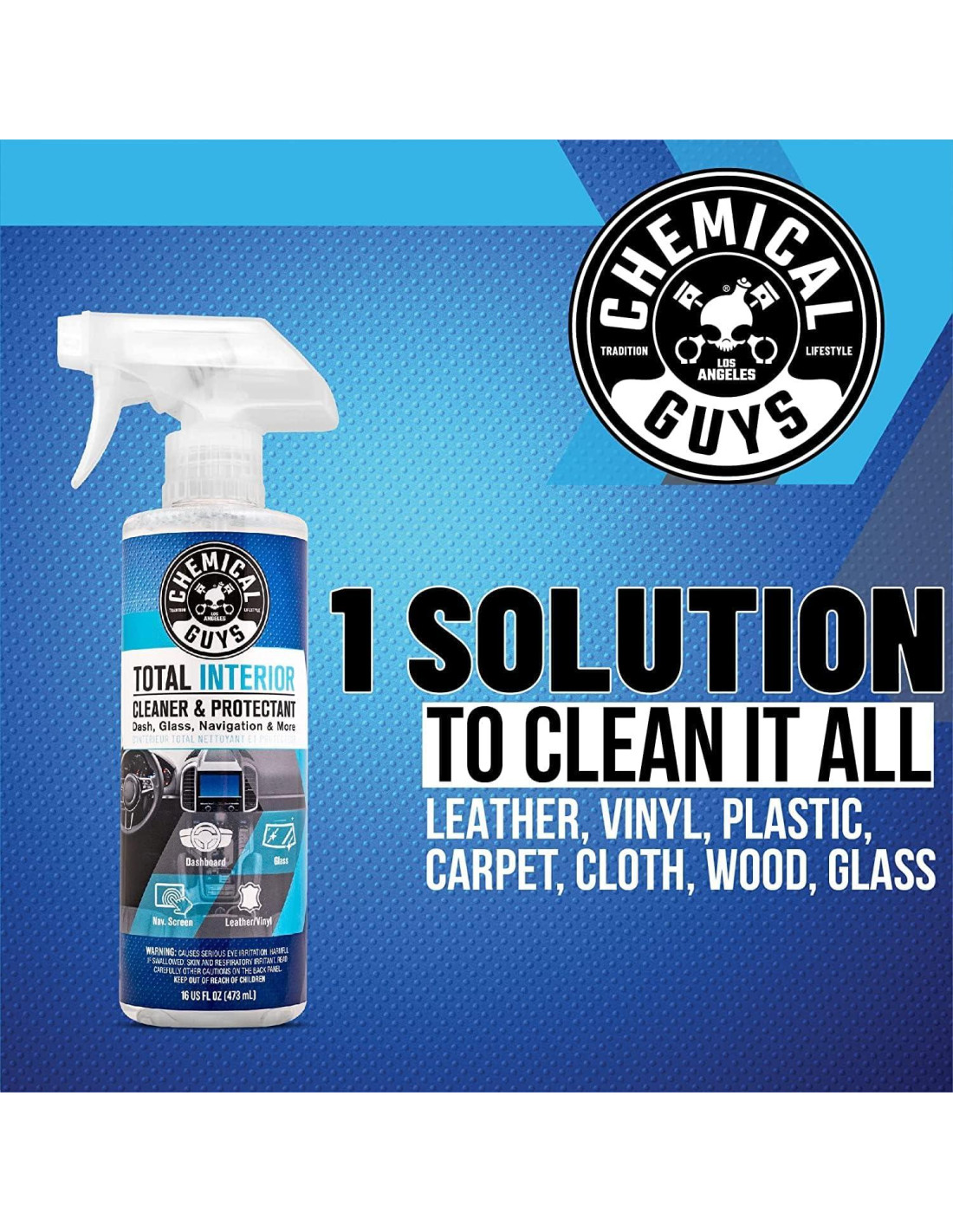 El Limpiador y Protector Total para Interiores Chemical Guys es la solución definitiva todo en uno para el interior de tu auto. Limpia de manera segura tableros, paneles de puertas, cuero, vinilo y más, mientras ayuda a prevenir grietas y desvanecimiento. Sin residuos grasos, solo un aspecto fresco y de acabado de fábrica en cada limpieza. Limpia y protege el interior de tu auto en un solo paso. Esta poderosa fórmula elimina suciedad, polvo y mugre mientras deja un acabado fresco y sin rayas. Seguro para cuero, vinilo, plástico y más, restaura el aspecto original de tu auto sin residuos grasos. Mantén el interior de tu auto impecable con una fórmula diseñada para limpiar y proteger asientos de cuero, tableros de vinilo y molduras de plástico. Levanta la suciedad y la mugre sin esfuerzo mientras deja un acabado natural, asegurando que tu interior se mantenga fresco y bien cuidado. No solo para autos, ¡úsalo también en superficies del hogar y la oficina! Este limpiador versátil funciona en muebles, electrodomésticos y más, ofreciendo la misma limpieza y protección poderosa más allá de tu vehículo. Mantén tu espacio fresco e impecable con facilidad. Enfrenta los desordenes rápidamente con una fórmula en spray fácil de usar, perfecta para retoques rápidos o limpieza profunda. Simplemente rocía y limpia la suciedad, manchas y huellas dactilares para un interior renovado e impecable sin la molestia de múltiples productos. Elimina rápidamente y de manera efectiva la suciedad, el polvo, las manchas y las huellas dactilares de todas las superficies interiores, haciendo que el interior de tu auto luzca impecable y limpio.