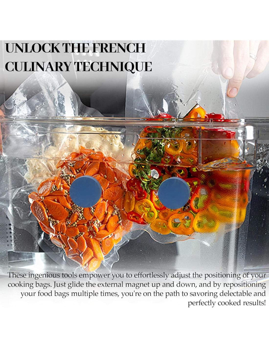- DESCUBRE LA TÉCNICA CULINARIA FRANCESA - ¿Alguna vez has reflexionado sobre la impecable maestría sous vide de la cocina francesa? La respuesta radica en un método francés discreto: ¡imanes! Estas ingeniosas herramientas te permiten ajustar sin esfuerzo la posición de tus bolsas de cocción. Simplemente desliza el imán externo hacia arriba y hacia abajo, y al reposicionar tus bolsas de comida múltiples veces, ¡estás en el camino de saborear resultados deliciosos y perfectamente cocidos!