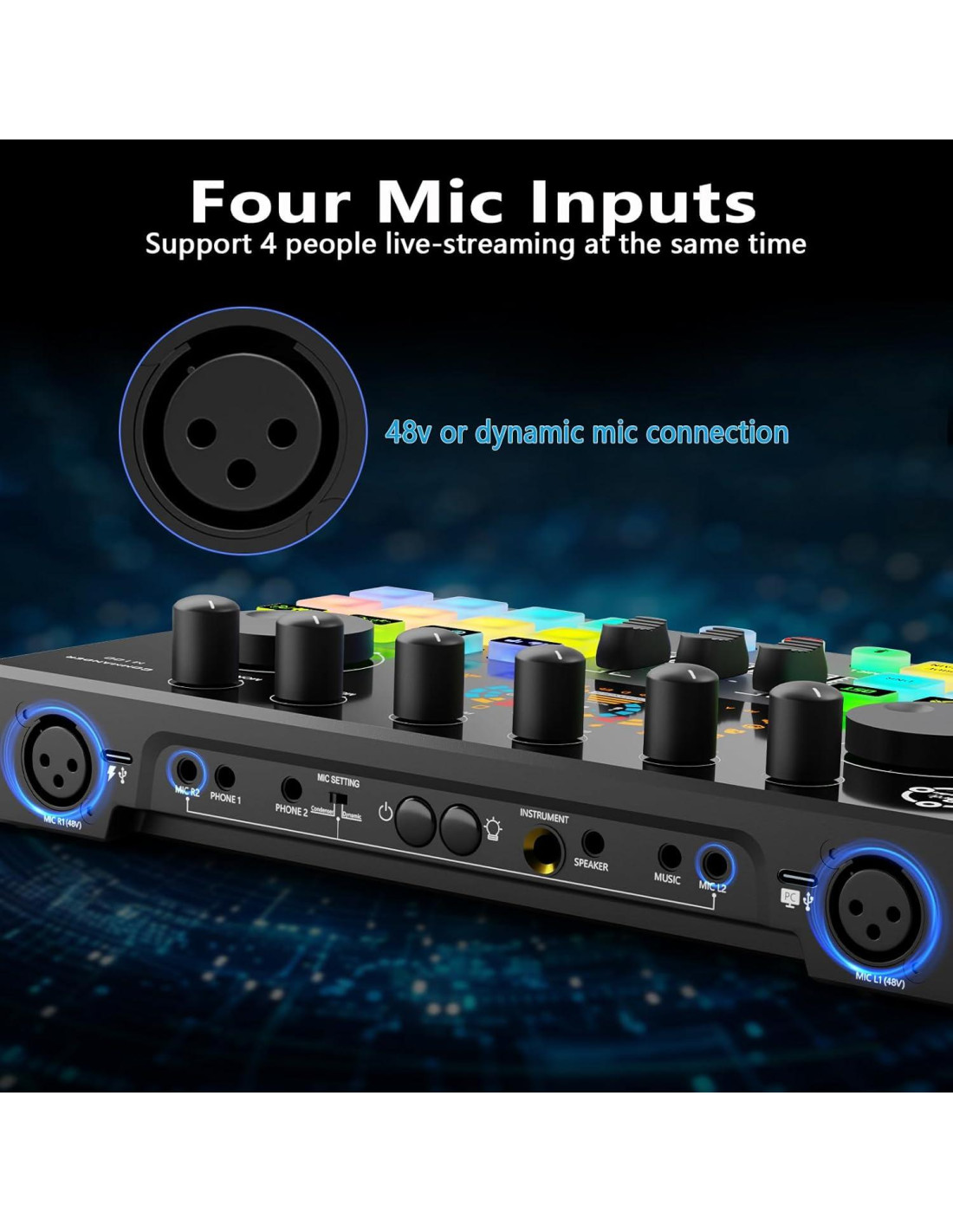 - Aspectos destacados: Los aspectos destacados del paquete de podcast son que el mezclador de audio tiene 4 entradas de micrófono, la entrada de micrófono XLR soporta micrófonos de condensador y dinámicos de 48v, soporta streaming en vivo para 4 personas simultáneamente. Modo de luz colorido que hace que tu transmisión en casa presente un 'espectáculo de luces', estableciendo una nueva tendencia para el podcasting.