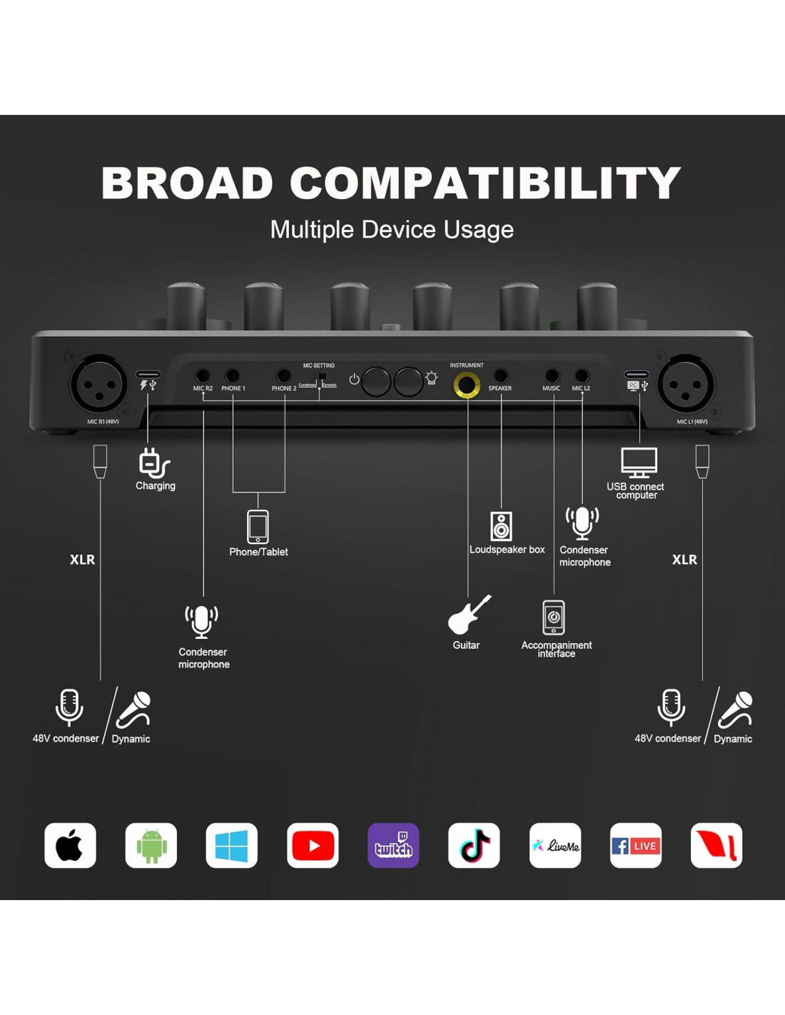 - No se requiere software especializado complicado: este mezclador de audio es fácil de configurar, plug and play, no se requiere software especializado complicado, no se requieren descargas de controladores, solo conéctalo a tu computadora o smartphone, amplia compatibilidad con la mayoría de los sistemas operativos y software de terceros, como Windows, iOS, Android, TikTok, YouTube...