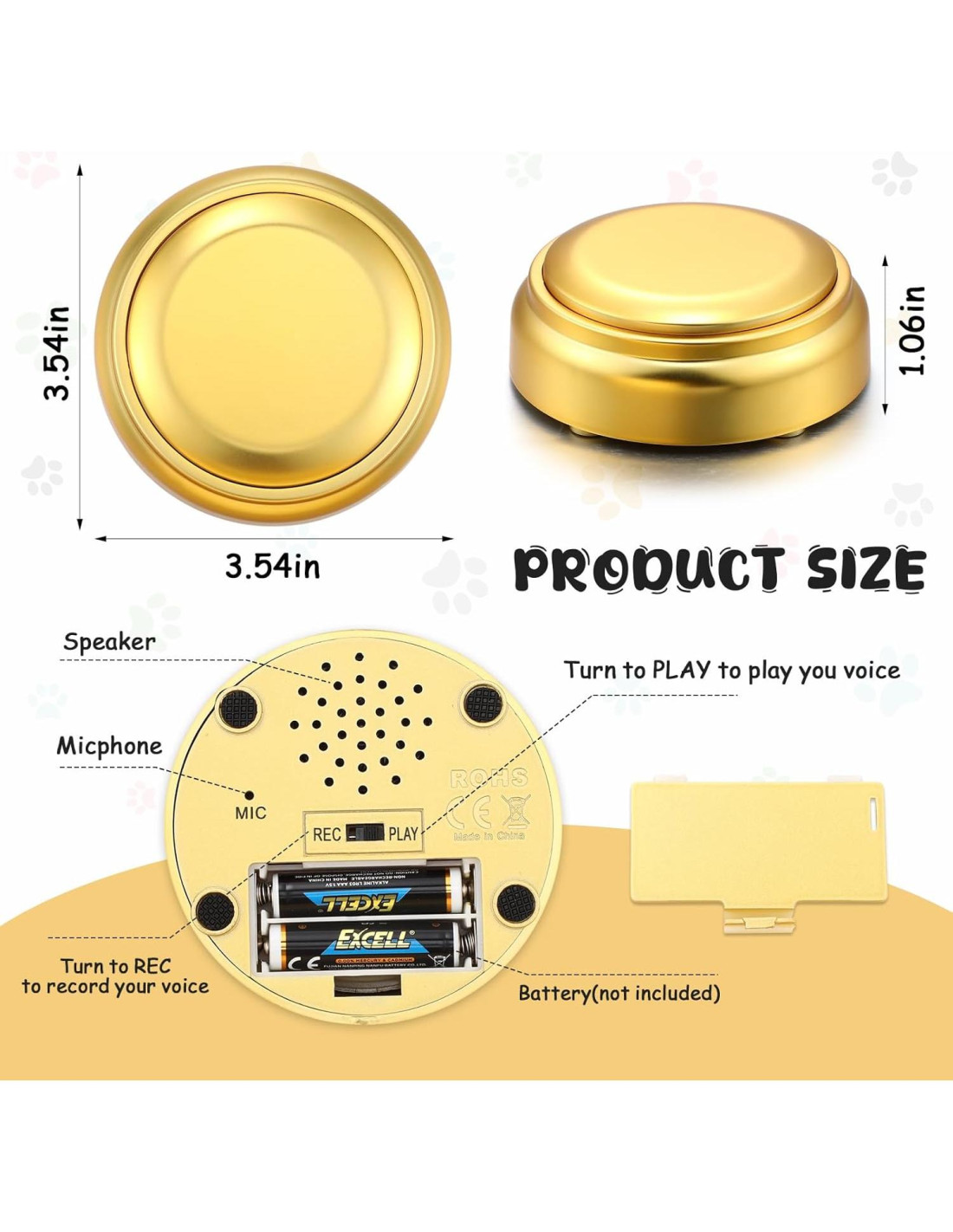 Características: Lugares Aplicables: estos botones de sonido para gatos se pueden utilizar no solo para comunicarse con mascotas, entrenar a las mascotas para que se expresen, acercarte más a ellas. También se pueden colocar fuera de la puerta como un timbre, o como un accesorio de juego en una fiesta. Pasos de Uso: Primero, presiona el botón REC en la parte inferior de los botones de voz, comienza a grabar el mensaje de voz después de escuchar un 'beep'. Segundo, suelta el botón REC después de terminar la grabación, entonces podrás escuchar 'beep beep', eso significa que tu grabación ha sido exitosa. Finalmente, presiona el botón superior, escucharás tu voz grabada. Especificaciones: Material: plástico ABS de calidad Color: dorado Tamaño: 9 cm de diámetro Paquete incluye: 6 x botones para perros Notas: El problema con este botón de grabación de voz es que no hay una alfombrilla extra para asegurarlos, lo que significa que tendrás que preparar algo como cinta tú mismo, para evitar que el botón sea pateado por las mascotas. Los artículos pequeños están incluidos, por favor mantenlos alejados de las mascotas en caso de riesgo de asfixia. Antes de comprar, confirma si el tamaño del producto es adecuado para tu mascota y observa la reacción de la mascota al usarlo. Por favor, retira el producto a tiempo si hay alguna incomodidad.