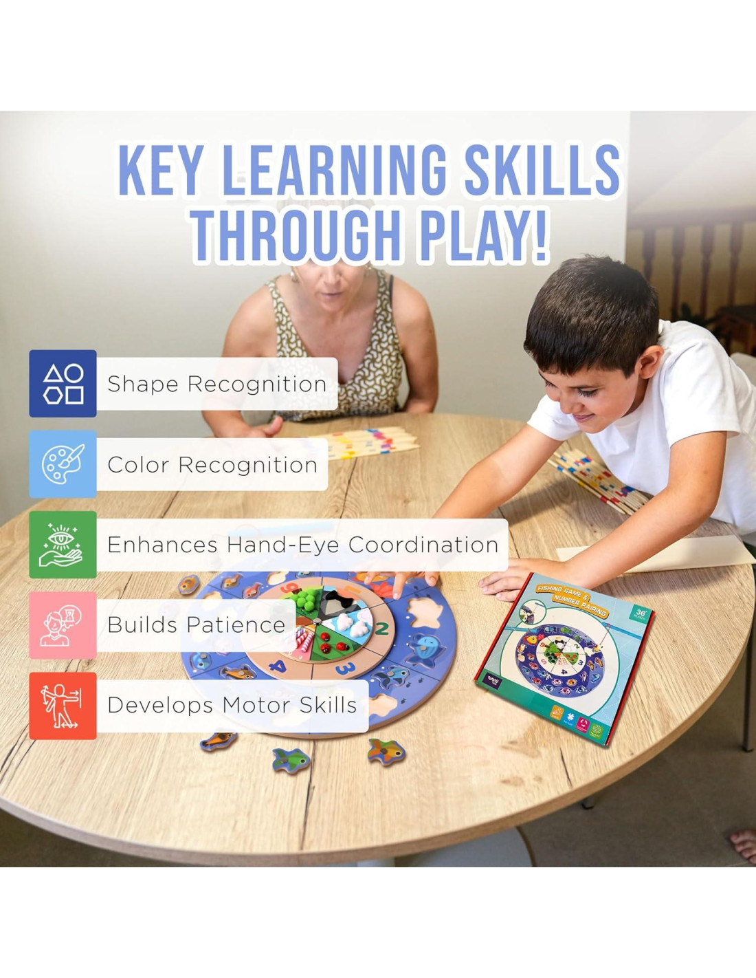 Juguete Educativo Temprano de Aprendizaje de Números para Niños y Niñas. Observa cómo tu hijo disfruta aprendiendo mientras se divierte. Mejora la Imaginación y las Habilidades de Resolución de Problemas - Una forma divertida de impulsar la creatividad y el pensamiento crítico de los niños. Desarrolla Habilidades Motoras Finas - Ayuda a mejorar la precisión y el control. A los niños les encantará pescar peces con la caña de pescar magnética. Mejora la Coordinación Mano-Ojo - Fortalece la coordinación entre el cerebro y las manos.