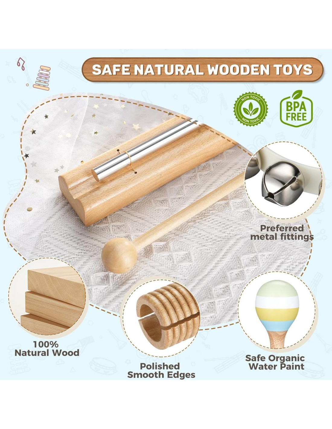 - Material Seguro y Libre de BPA: Hecho de madera sólida natural pura, pintura no tóxica y metal de primera calidad. Este conjunto de juguetes de instrumentos musicales para niños pequeños está finamente pulido y cuida cuidadosamente la seguridad de tu hijo. Es la manera perfecta de enseñar a tus hijos y comenzar su viaje musical.