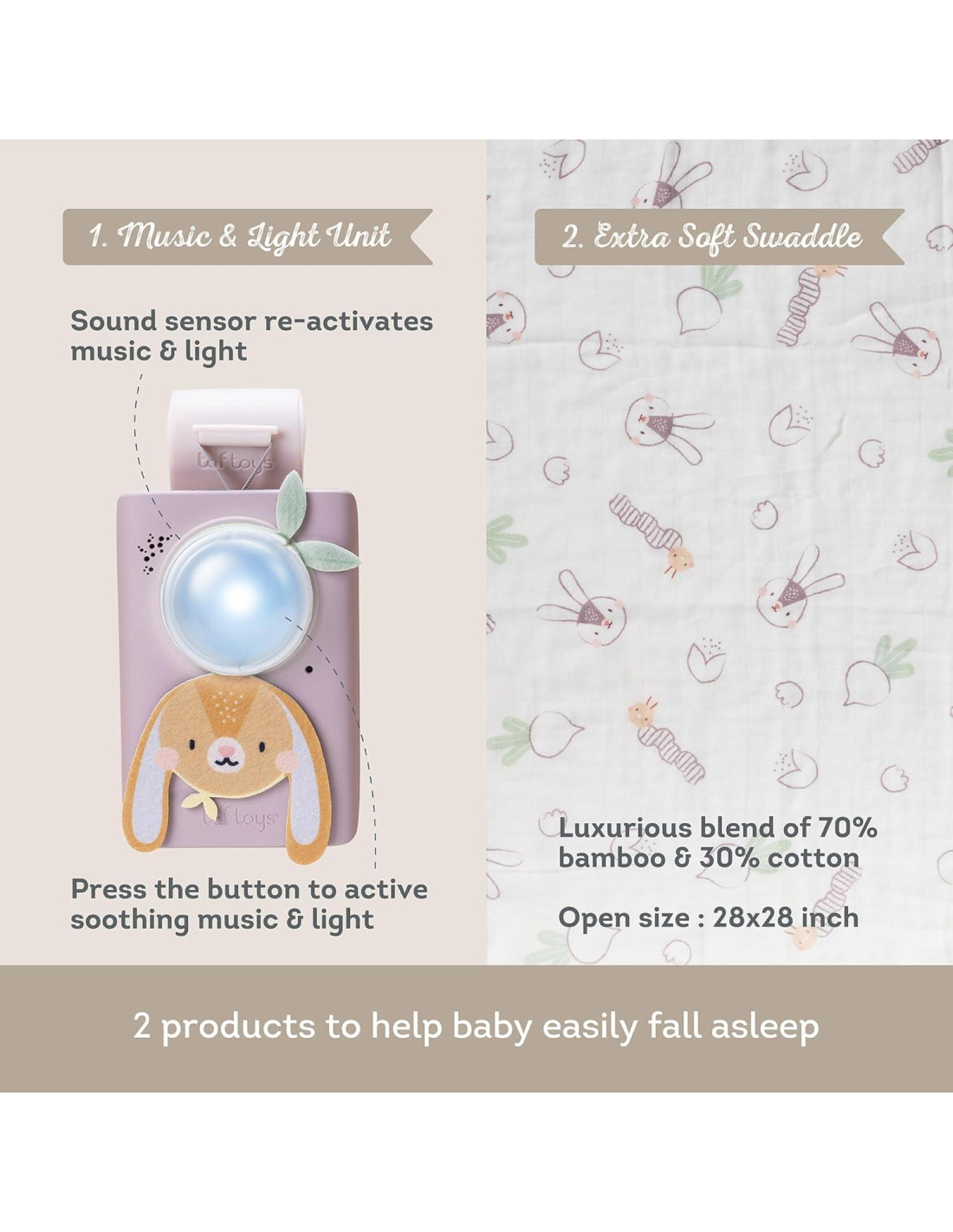 Aquí en Taf Toys desarrollamos y diseñamos juguetes que ayudan a crear una experiencia de crianza más suave, permitiéndote concentrarte en disfrutar cada momento con tu bebé. Ya sea en la hora de la comida, la hora de dormir o al salir a pasear, nuestros juguetes cuidadosamente diseñados contribuyen al desarrollo de tu bebé mientras proporcionan momentos agradables e íntimos de amor, diversión, cuidado y emoción con tu bebé. Este conjunto ofrece una experiencia reconfortante y calmante para tu bebé, especialmente a la hora de dormir. El sensor de sonido en el soother de Conejo está diseñado para ayudar a que el bebé se mantenga dormido. Después de reproducir 30 minutos de sonidos calmantes, el juguete entra en modo de espera. Si tu bebé comienza a llorar o hacer ruido, el sensor de sonido lo detectará y reactivará automáticamente la música y la luz suave para ayudar a calmar y tranquilizar a tu bebé de nuevo para que duerma. 1. Los sonidos del "modo calmante" incluyen el sonido de un arroyo de agua, susurros y ruido blanco de lluvia, acompañados de luz suave. - Cada sonido se reproduce durante 15 minutos, justo el tiempo suficiente para que el bebé se duerma. - El modo de espera del juguete comienza después de que el juguete reproduce 15 minutos de sonidos calmantes. La música se reactivará si o cuando el bebé comience a llorar o hacer ruido. - El sensor de sonido reactivará la música y la luz cuando el bebé comience a llorar, ayudándolo a volver a dormir. 2. Los sonidos del "modo de juego" incluyen 4 melodías con voz infantil. 3. El "modo de luz" activa 10 minutos de luz suave nocturna. 4. Envoltura para un sueño acogedor.