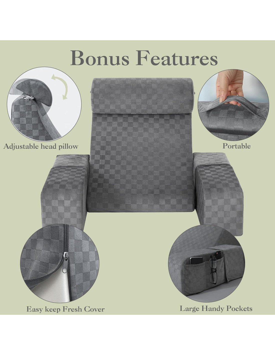 - Soporte Mejorado para los Brazos: Hemos encontrado que la mayoría de los cojines de lectura con brazos en el mercado, el brazo del cojín de respaldo solo puede proporcionar soporte cuando se reclina en un ángulo bajo. Por eso mejoramos la altura del brazo a 7.3in (18.54cm), que soporta perfectamente nuestros brazos con decencia, ya sea sentado en la cama, disfrutando de estar sentado en el sofá, trabajando, amamantando, tejiendo, leyendo, viendo TV o jugando.