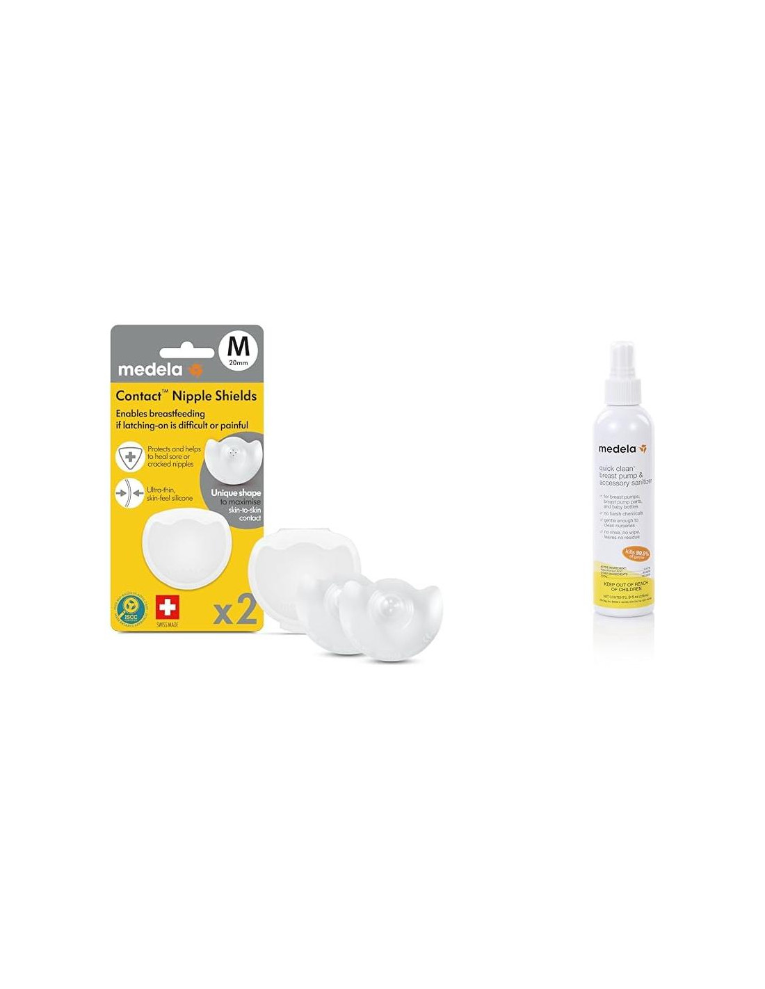 Este paquete de lactancia incluye dos productos de Medela para ayudar a proporcionar soluciones a los desafíos comunes de la lactancia. El primer componente es un paquete de 2 unidades de los escudos de pezón pequeños de 20mm de Medela, hechos de silicona ultra delgada y suave al 100%. Diseñados de manera única con un área recortada para fomentar el máximo contacto piel a piel entre mamá y bebé, estos escudos abordan problemas como el dolor, la dificultad para engancharse y los pezones planos o invertidos. El segundo componente es una botella de 8 onzas líquidas ( aproximadamente 236.6 ml) del spray desinfectante Quick Clean de Medela para extractores de leche y accesorios, que elimina el 99.9% de bacterias y virus, incluyendo el VRS. Esta solución sin enjuague no contiene productos químicos agresivos y puede desinfectar suavemente extractores de leche, piezas, botellas, pezones y otros accesorios en solo 60 segundos, facilitando mantener los artículos de alimentación limpios en casa o en movimiento. Juntos, estos productos diseñados cuidadosamente proporcionan soluciones para apoyar la lactancia exitosa a través de desafíos comunes. El innovador diseño del escudo de pezón ayuda al bebé a engancharse mientras permite que la piel de mamá tenga contacto con la del bebé para la transferencia de leche y el vínculo. Y el spray desinfectante asegura que los artículos de alimentación estén higiénicamente limpios para la salud del bebé. Este paquete ofrece los productos y el apoyo que las madres lactantes necesitan para amamantar con confianza.