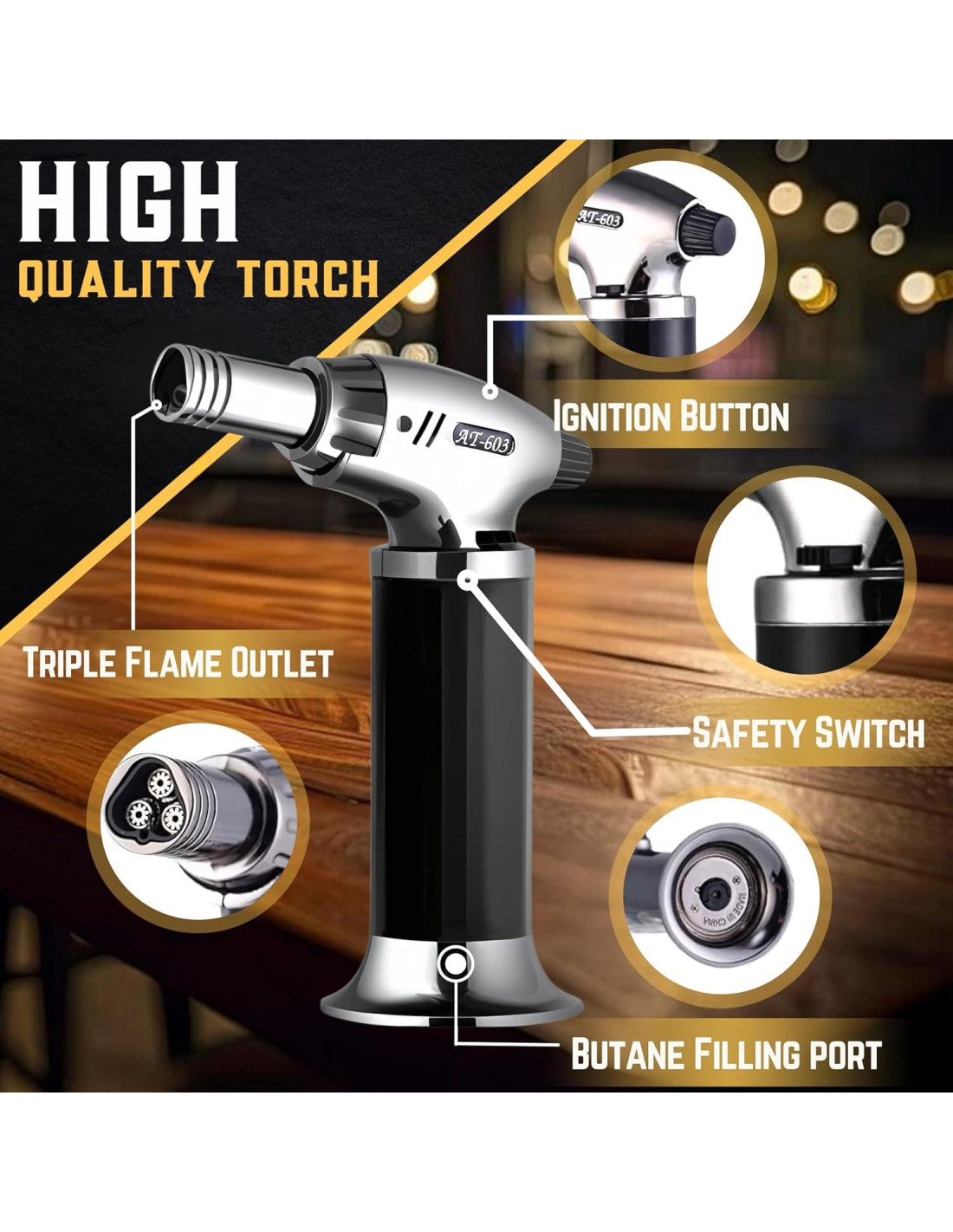 - ANTORCHA DE TRES LLAMAS - IGNICIÓN RÁPIDA, ALTA SALIDA DE CALOR La antorcha de butano de 3 jets incluida (butano no incluido) produce calor intenso y concentrado para la ignición inmediata de astillas de madera y salida de humo sostenida. Diseñada con un dial de llama ajustable, te permite controlar la tasa de combustión y la densidad del humo. Ideal para ciclos de infusión cortos y combustión eficiente con mínimo desperdicio de combustible.