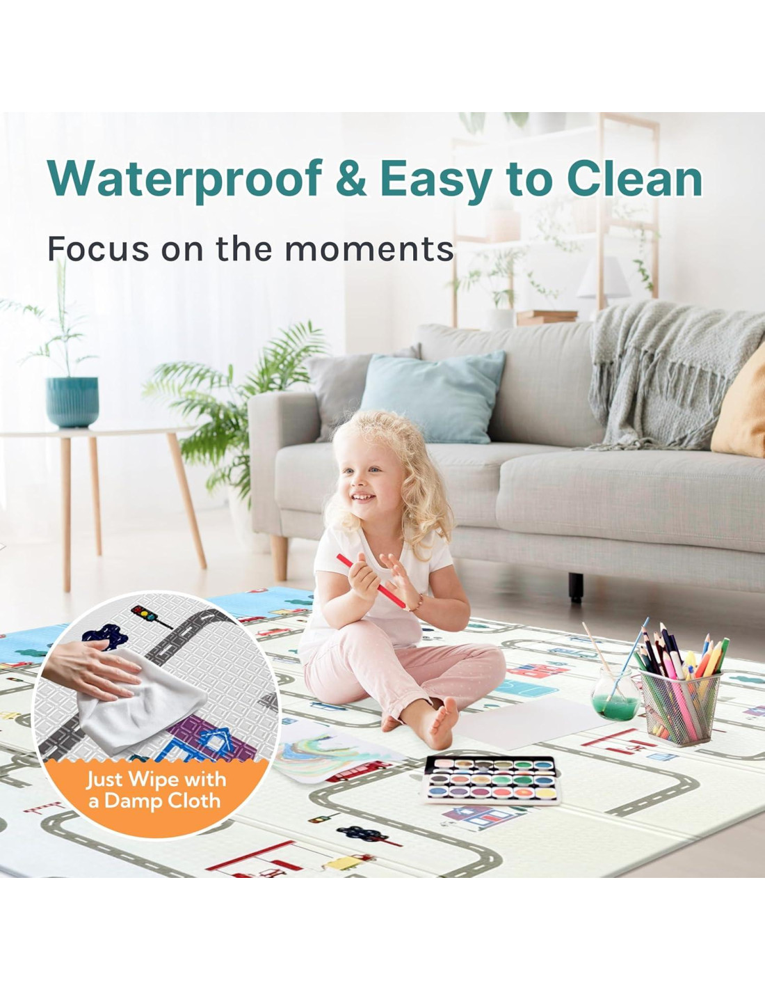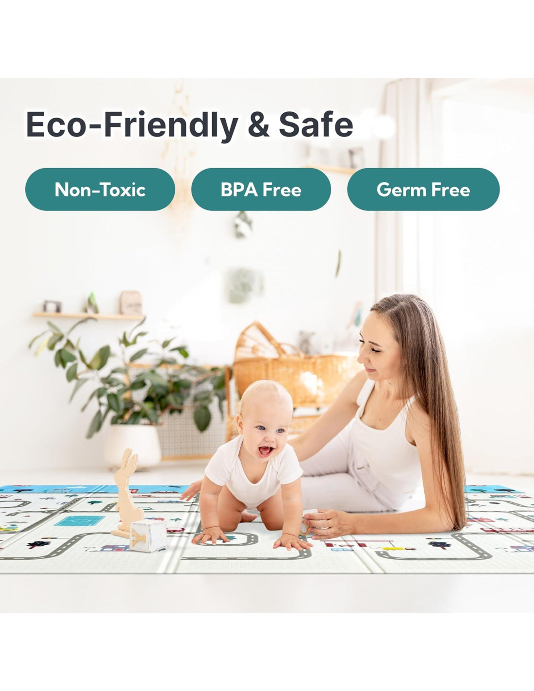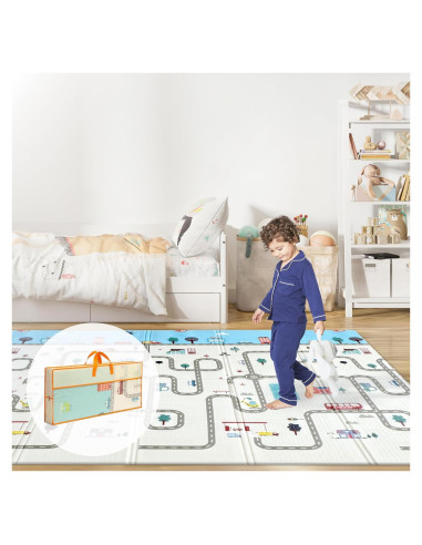 - - Doble cara: La alfombra tiene dos lados con diferentes diseños e información útil. Un lado tiene coches y carreteras, y el otro lado tiene el alfabeto con animales.