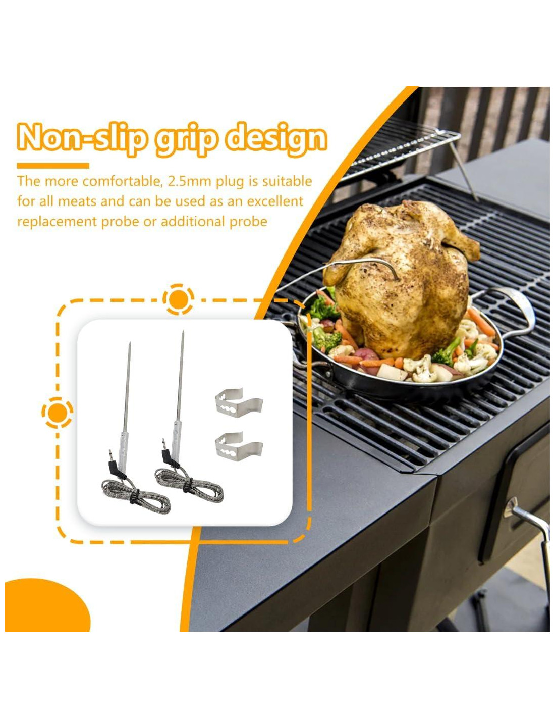 - Las sondas de reemplazo te ayudarán a monitorear la temperatura de tu comida, insertadas en la parrilla comienzan a leer inmediatamente la temperatura de la carne, y el clip de acero puede evitar que la sonda toque la rejilla. Rango de detección de temperatura: 32 F a 572 F (0 C a 300 C)