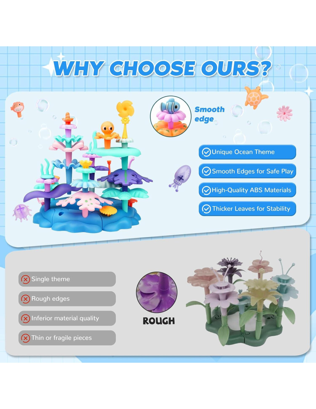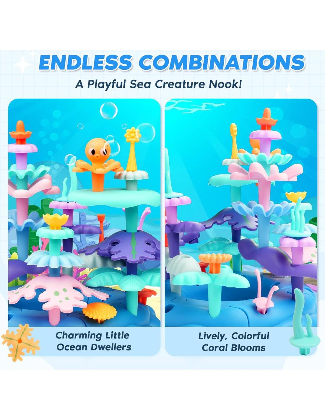 - Sumérgete en una aventura oceánica: ¡Despierta la imaginación de tu hijo con este set de construcción temático del océano! Con flores de coral, peces, camarones, mariscos y calamares, es el juguete STEM perfecto para niños de 3 a 5 años para explorar y construir su propio mundo submarino. Una adición divertida y atractiva a cualquier colección de juguetes de preescolar.