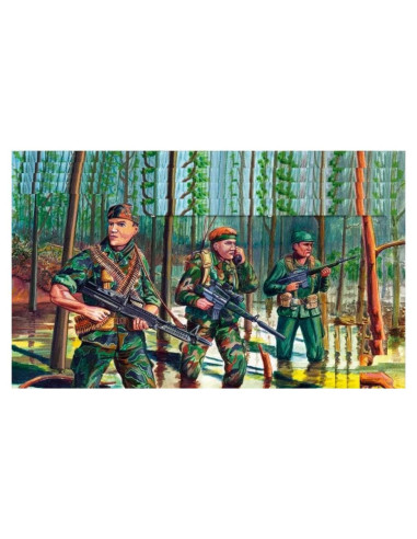 Fuerzas de Operaciones Especiales de EE. UU. (boinas verdes), Guerra de Vietnam kit de modelo de plástico a escala 1/32 Mars Figures 32008 Fabricante: Mars Figures (Ucrania) Escala: 1/32 Material: Plástico Pintura: Sin pintar, ensamblado, el kit no contiene pinturas ni pegamento. Condición: Nuevo en Caja Tropas de Fuerzas Especiales de EE. UU. (Boinas Verdes), guerra de Vietnam en escala 1:32 El kit consiste en: 15 figuras en diferentes poses Altura promedio de la figura, mm: 56