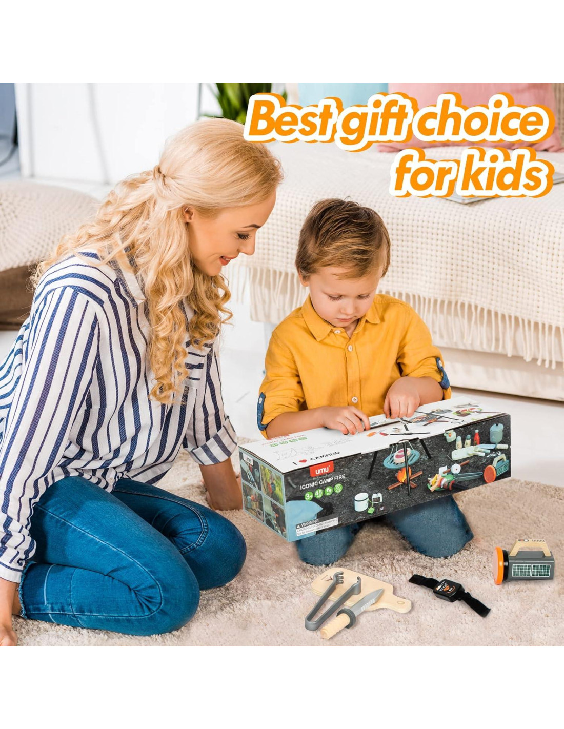 - [Simular Conjunto de Camping Real para Niños] Conjunto de juego de camping ultra completo de UMU con mochila de camping portátil para niños. El juguete de camping para niños con fuego incluye 1 bolsa de almacenamiento tipo alfombra, 1 fogata de juguete, 1 soporte para fogata, 1 tapa, 1 tapa de tapa, 1 reloj, 1 linterna de 2 en 1, 1 tabla de cortar, 1 cuchillo, 1 cuchillo tenedor plegable, 1 kit de utensilios, 1 linterna y 11 alimentos. El conjunto de camping para niños de UMU con mochila de camping puede captar la atención y curiosidad de los niños. Optimización sugerida: Resaltar la variedad de artículos incluidos en el conjunto.