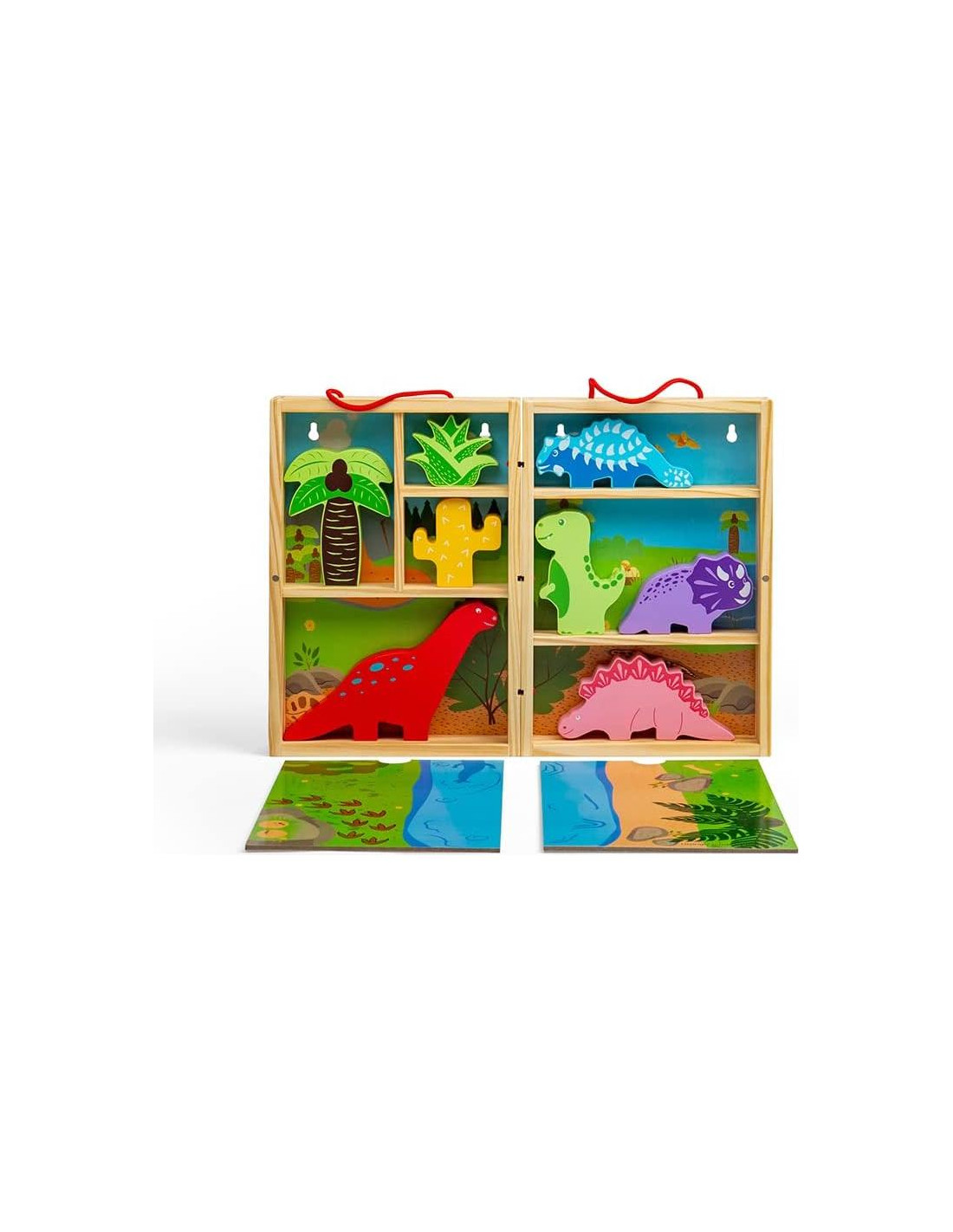 - GRAN JUGUETE DE VIAJE - Nuestro juego de madera de dinosaurios es ligero y compacto; cada uno de los dinosaurios, accesorios y escenas de juego encajan perfectamente en la caja - asas de cuerda roja para un fácil transporte