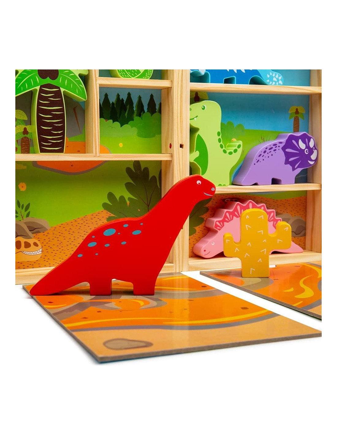 Lleno de valor de juego, nuestra Caja de Juego de Dinosaurios introduce a los niños a un mundo jurásico de dinos amigables. Este divertido conjunto de actividades para niños presenta dinosaurios de madera gruesos como un T-Rex, Diplodocus, Estegosaurio, Triceratops y Anquilosaurio, así como piezas de juego exóticas como un cactus, aloe vera y palmera. Completo con escenas de alfombrillas de juego plegables para dar vida a los juguetes, los escenarios imaginarios son infinitos. La caja de madera compacta facilita el almacenamiento y es ideal para llevar cuando se está en movimiento o viajando. Hecho de materiales de alta calidad, de origen responsable y cumple con las normas de seguridad europeas actuales. Prácticas asas de cuerda para un fácil transporte. Apto para 18 meses +. Caja de Juego de Dinosaurios - características del producto: Caja de juego de madera con dinosaurios y alfombrillas de juego plegables Piezas gruesas Ideal para viajar Apto para 18 meses + 22cm H x 22cm W