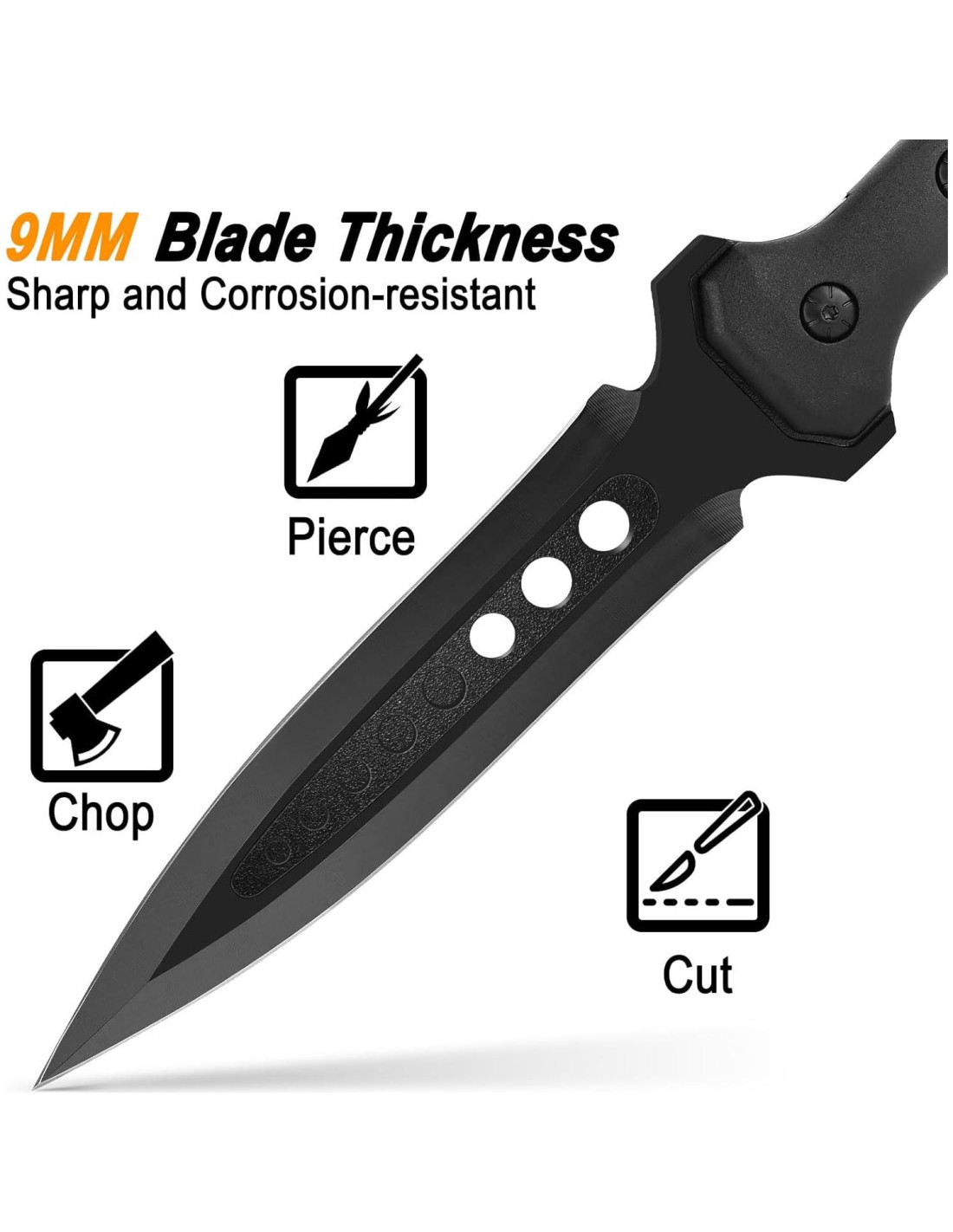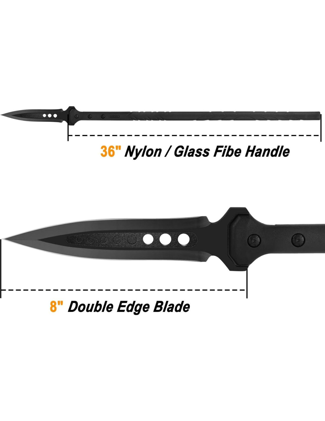 - [HOJA AFILADA] La punta de lanza de 9mm de grosor, extremadamente afilada, está fabricada con acero inoxidable 2Cr13 duradero para resistir la corrosión y mantener el filo. La hoja de doble filo proporciona perforación, clavado y ruptura. Puede darte ventaja en defensa personal y es un arma versátil para la supervivencia y la caza.