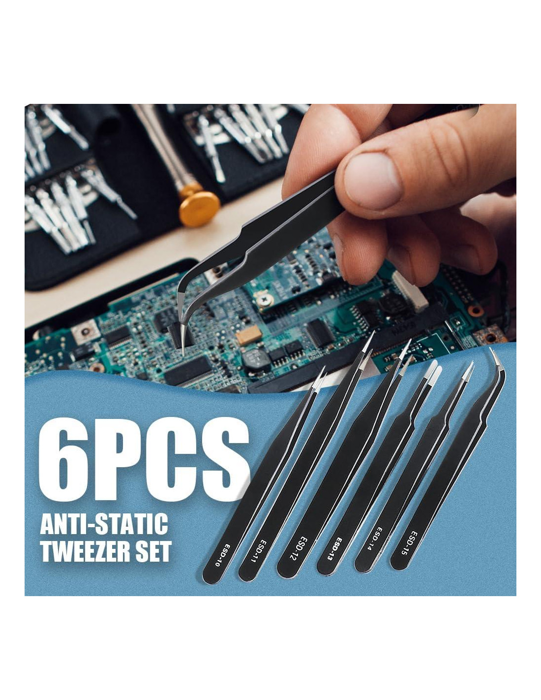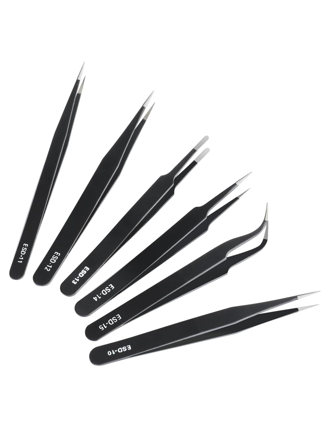 - Colocación Multifuncional: Este juego de pinzas ESD para electrónica tiene 6 pinzas diferentes para adaptarse a tus diferentes necesidades. Excelente para reparación de PCB, electrónica, joyería, trabajo de laboratorio, pestañas cosméticas y manualidades.