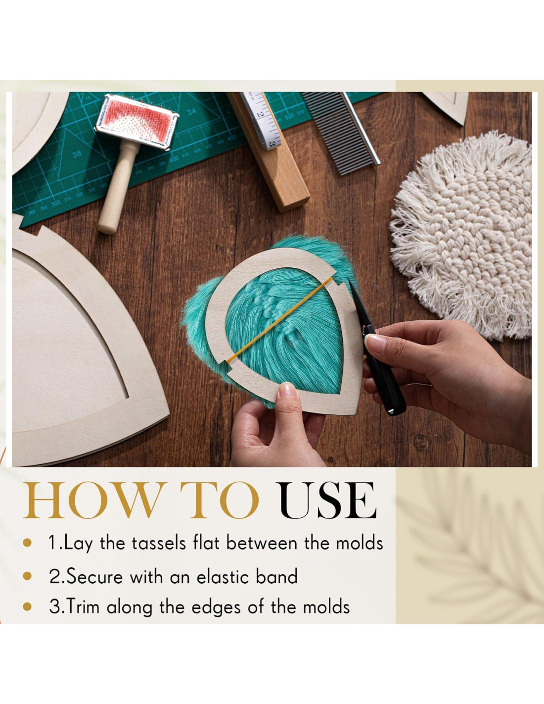 - Fácil de Usar: usar las herramientas en nuestros accesorios y herramientas de macramé es sencillo; Todo lo que necesitas hacer es colocar la borla plana entre los moldes, fijarla con una banda elástica y recortar a lo largo del borde del molde; Estas instrucciones amigables aseguran que tu proceso de creación sea fácil, ya seas principiante o experimentado