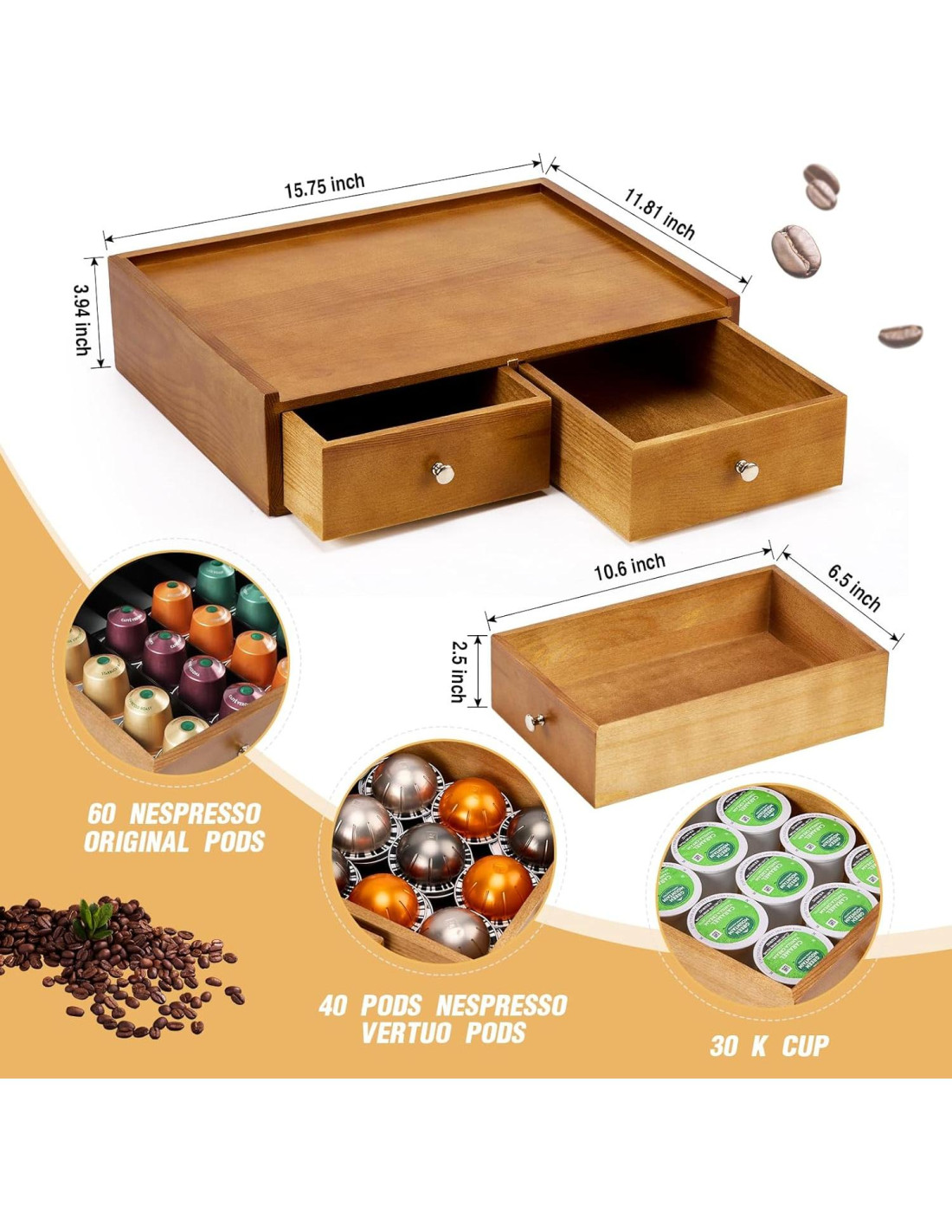 - Almacenamiento de fácil acceso: Dos cajones organizadores de almacenamiento se ajustan perfectamente para evitar interferencias mutuas. Su profundidad permite que las K cups se almacenen en posición vertical con las etiquetas visibles, evitando que rueden o se atasquen para un uso más fácil. El espacio de almacenamiento libre también proporciona espacio para otros electrodomésticos de cocina.