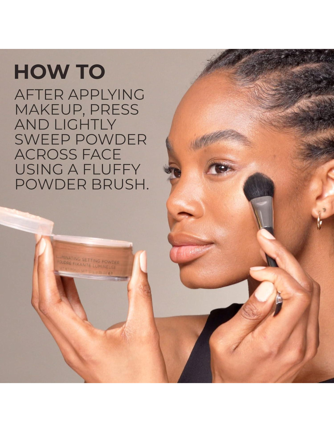 - CÓMO USAR: Después de aplicar el maquillaje, toma el polvo usando una brocha para polvo y quita el exceso. Presiona, enrolla y barre suavemente por toda la cara para un brillo general.