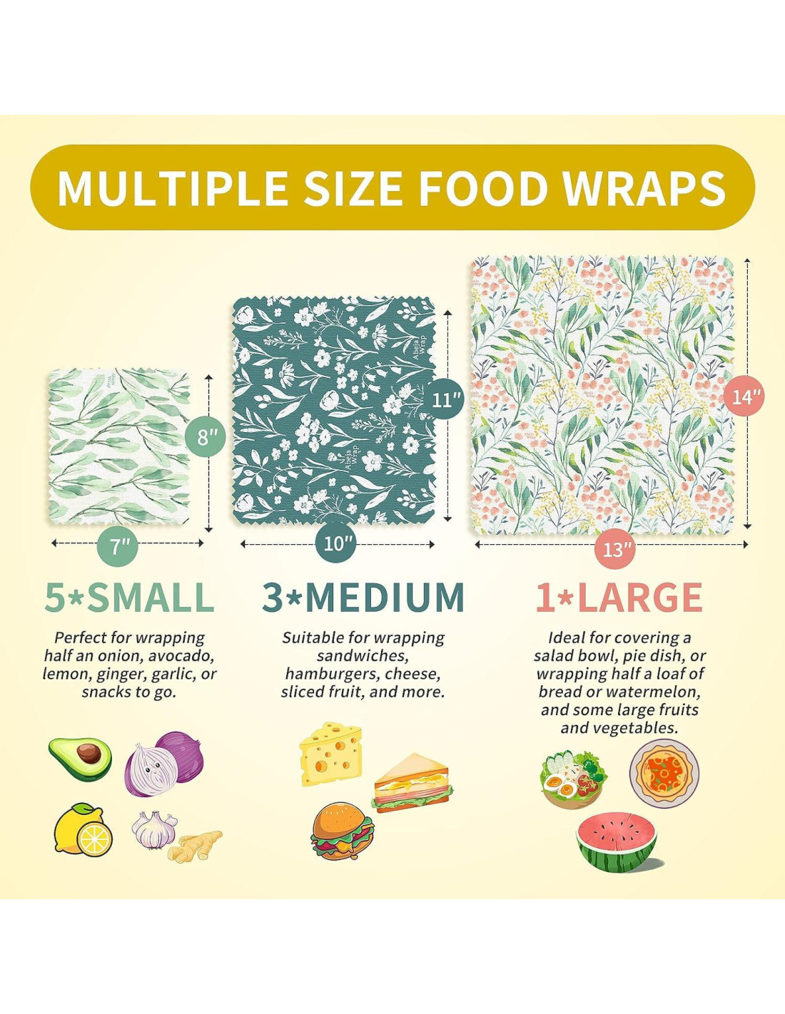 - Tamaños Versátiles para Cada Necesidad: Este juego de envolturas de cera de abeja incluye tres tamaños: 1 grande (33 x 36 cm), 3 medianas (25 x 28 cm) y 5 pequeñas (18 x 20 cm). Estas envolturas se adaptan a diversas necesidades, desde envolver sándwiches y sobras hasta almacenar frutas y verduras. Perfectas para loncheras o picnics, brindan comodidad y versatilidad diaria.