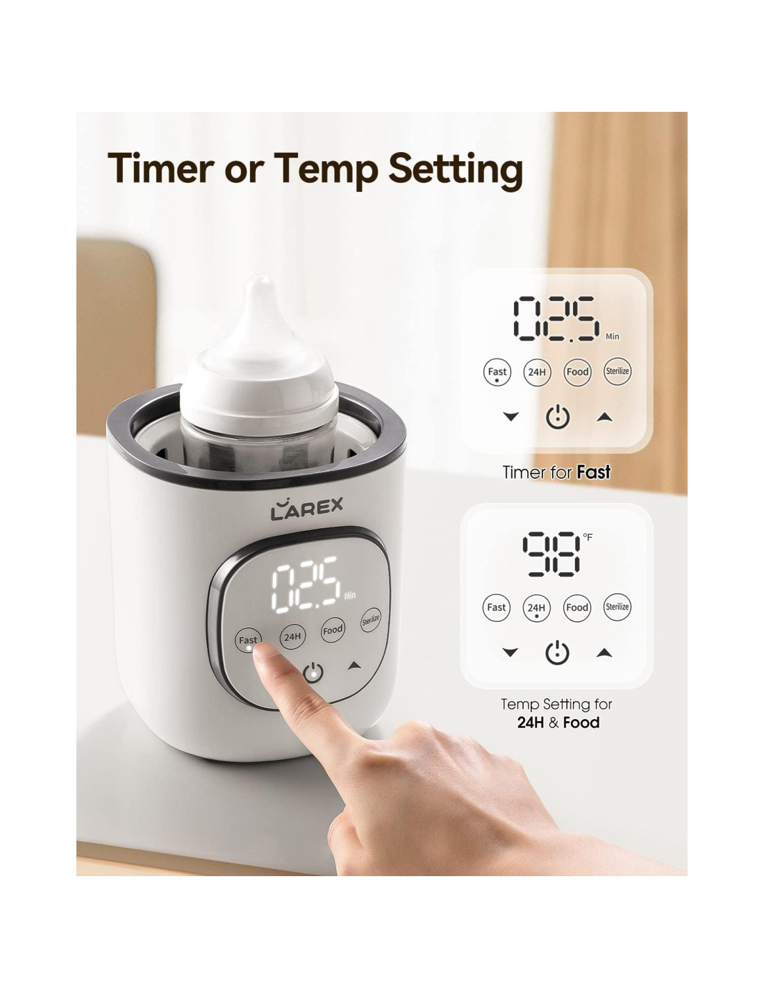 Calentamiento Rápido - Calienta 4oz (118.3ml) de leche de temperatura ambiente a temperatura corporal segura en solo 3 minutos. (El tiempo de calentamiento depende del volumen de leche, la temperatura inicial y el material del recipiente.) Solo lo Justo Cada Vez - Adopta sensores inteligentes para monitorear el proceso de calentamiento. Elige el tiempo adecuado según la tabla de referencia, obtendrás leche tibia perfecta cada vez. Método de Calentamiento Suave - Utiliza baño de agua tibia para calentar la leche materna, una alternativa más segura a calentar en microondas y vapor, sin puntos calientes y preserva la bondad y los nutrientes vitales en la leche materna. Satisface todas tus demandas - incluyendo calentamiento rápido / termostato de 24H (también utilizado para calentamiento lento y descongelar) / calentamiento de alimentos / vapor / Temporizador / Configuración de temperatura / Función de memoria. Saber Claramente Cuándo Está Lista la Leche - La pantalla digital mostrará la cuenta regresiva o la temperatura en tiempo real para recordarte, y sonará 5 veces cuando la leche esté lista. Amplia Compatibilidad - El calentador Larex es compatible con todas las botellas de marcas líderes. Sin preocupaciones sobre la compatibilidad.