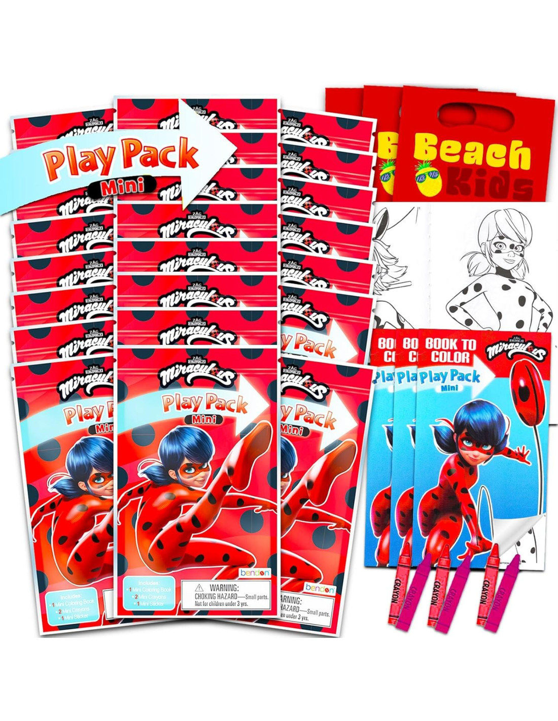 - Este conjunto de suministros para fiesta de Miraculous Ladybug cuenta con 24 mini Paquetes de Juego Grab n Go que incluyen cada uno un libro de colorear en miniatura, stickers y utensilios para colorear.