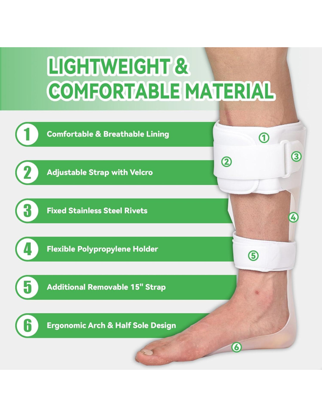 - Sistema de Comodidad Todo el Día: Amortiguación transpirable y amigable con la piel + correas ajustables en forma de D distribuyen la presión de manera uniforme, previniendo rozaduras. La construcción de polietileno ligero pesa menos que las ortesis tradicionales, mientras que la correa de pierna reforzada asegura soporte lateral sin restringir la circulación.