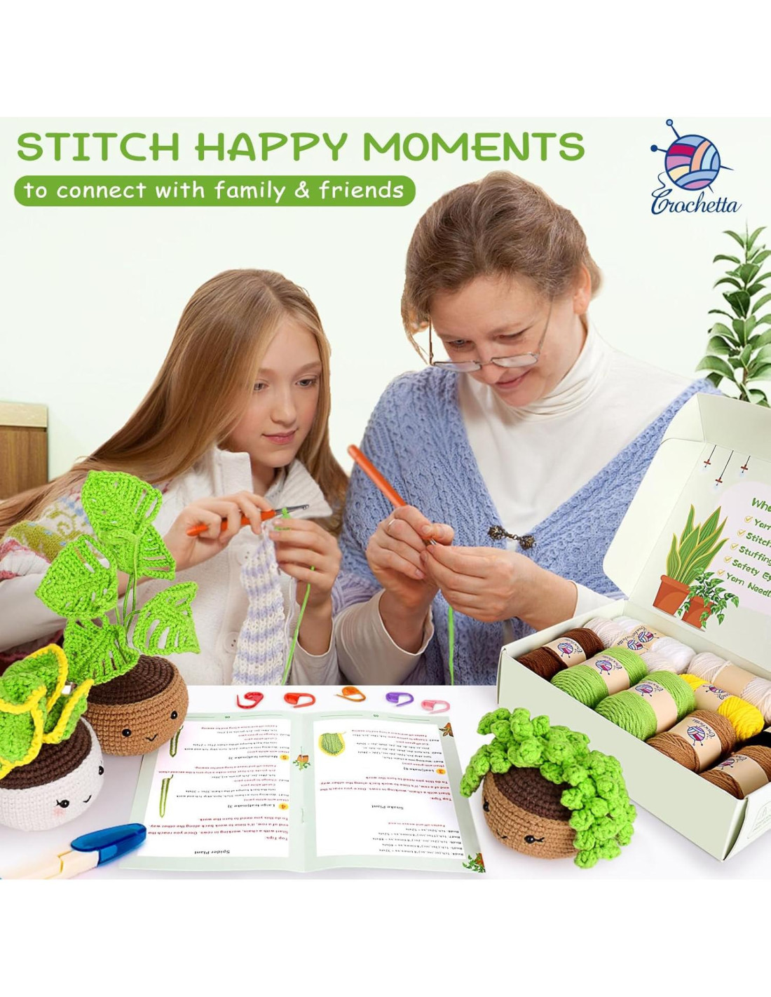 - Kit de Inicio de Crochet Todo en Uno: El kit de crochet para principiantes de CROCHETTA incluye todo lo que necesitas para comenzar: 11 hilos de diferentes colores, suficiente relleno, 1 aguja de hilo, 8 ojos de seguridad, 5 marcadores de puntadas, 2 ganchos de crochet ergonómicos, 1 par de tijeras, 1 pegamento caliente, alambres de hierro, 1 patrón de crochet de 4 plantas y un manual básico de crochet para principiantes.