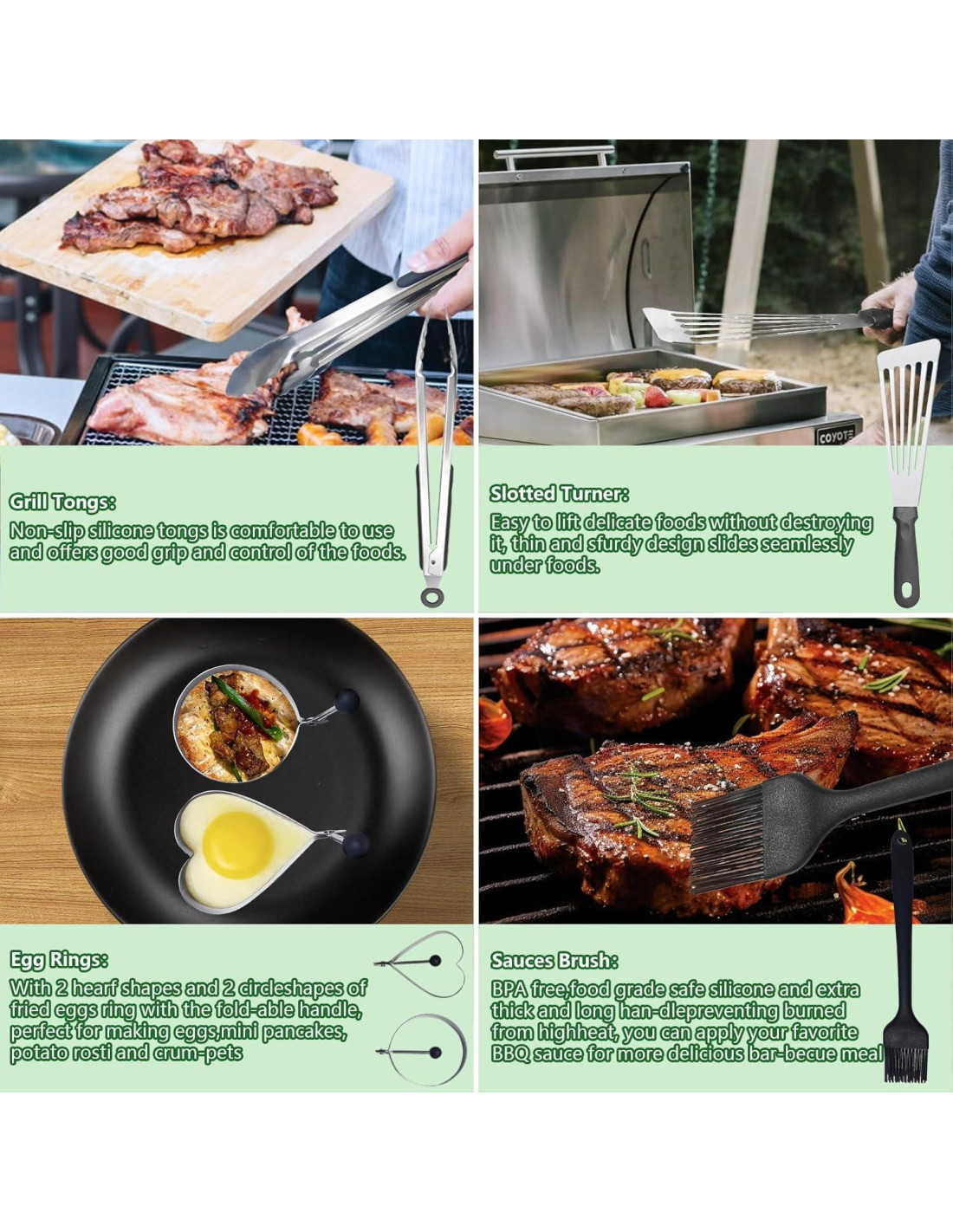 - [JUEGO DE ACCESORIOS BBQ PROFESIONAL 45PCS] Este kit de accesorios para plancha MEJORADO incluye: espátula para hamburguesas, espátula para voltear panqueques, espátula, tenedor para parrilla, espátula ranurada, tapa para basting, pinzas para parrilla, brocha para basting, 2 dispensadores de salsa, 4 anillos para huevo, 2 saleros, tijeras, guantes, inyector de carne, cepillo de limpieza, volteador de pescado, 10 ganchos para carne, 8 palos para carne, 4 soportes para maíz, bolsa de almacenamiento, caja de regalo de embalaje exquisita. Puede habilitarse para cualquier ocasión y diferentes tipos de parrillas.