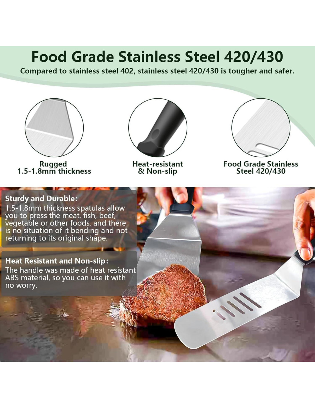 - [ELECCIÓN IDEAL PARA FAMILIA Y RESTAURANTE] Nuestro juego de herramientas para parrilla con raspador, espátulas y botellas de aceite son herramientas de plancha necesarias para la plancha Blackstone que le ayudan a asar tan fácilmente como un chef de restaurante. Genial para voltear hamburguesas, panqueques, verduras, cortar pan, carne y salchichas, raspador y cortador para picar alimentos y raspar las planchas limpias. La larga espátula para plancha puede mover grandes cantidades de comida rápida y con precisión. Anillos para huevo y saleros para mejorar su experiencia de cocción en la plancha.