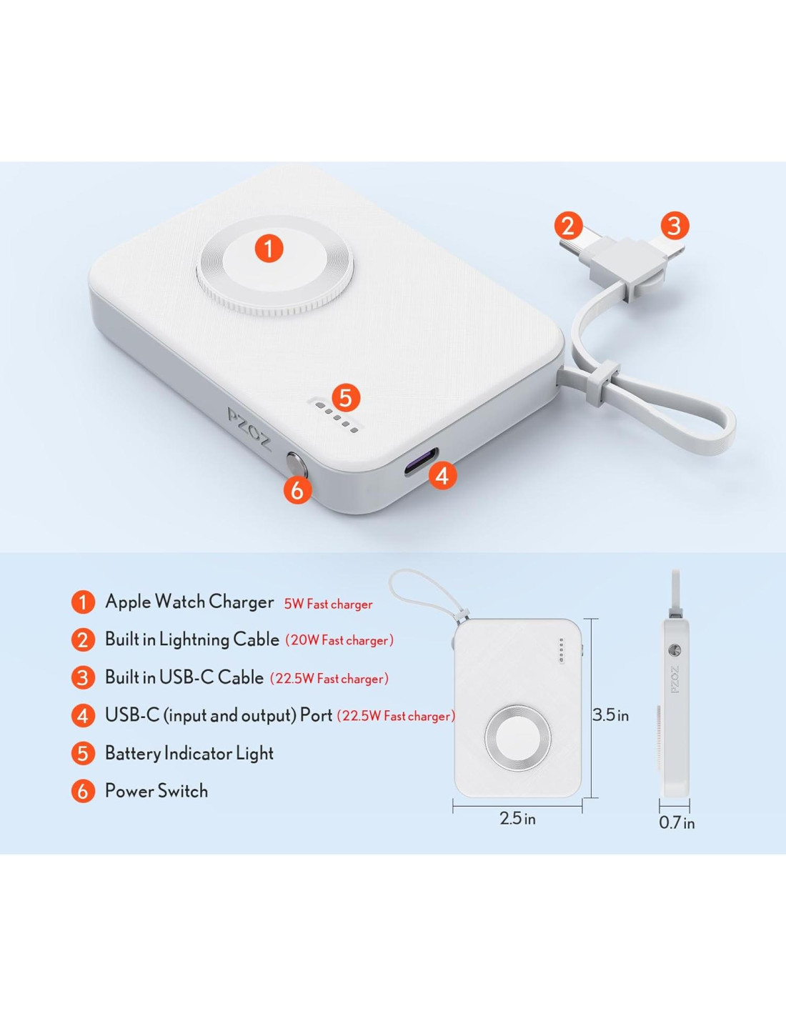 - [Diseño de Múltiples Puertos] El cable integrado proporciona 22.5W de potencia de salida. Un puerto dual de línea, puerto USB-C (salida) y puerto Lightning (salida). Y equipado con un puerto USB-C (entrada/salida), puede soportar carga rápida de 18W y PD3.0.