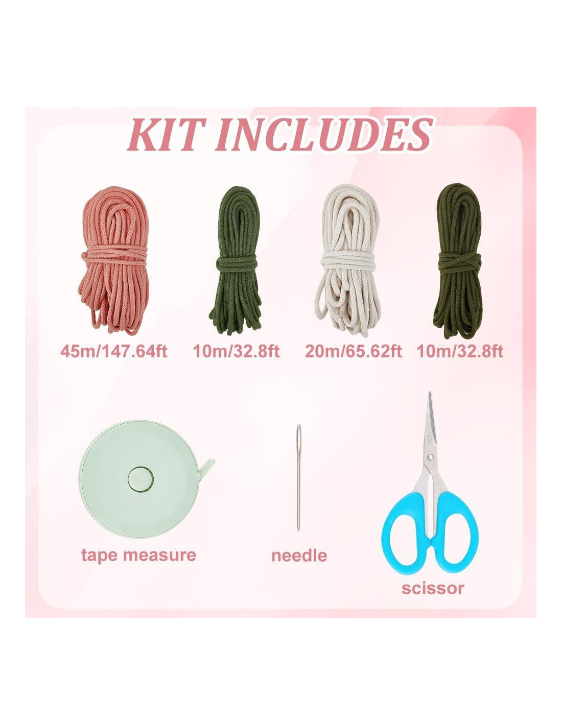 - Kit de Bolsa de Macramé Floral incluye: El paquete viene con 20m de cordón de algodón de 4mm, 10m de 2 colores verdes, 45m de rosa, cinta métrica, aguja de tapicería, todo lo que necesitas para hacer una bolsa de macramé DIY boho, deja que el kit de bolsa de macramé hecha a mano sea tu primer proyecto de aprendizaje de macramé.